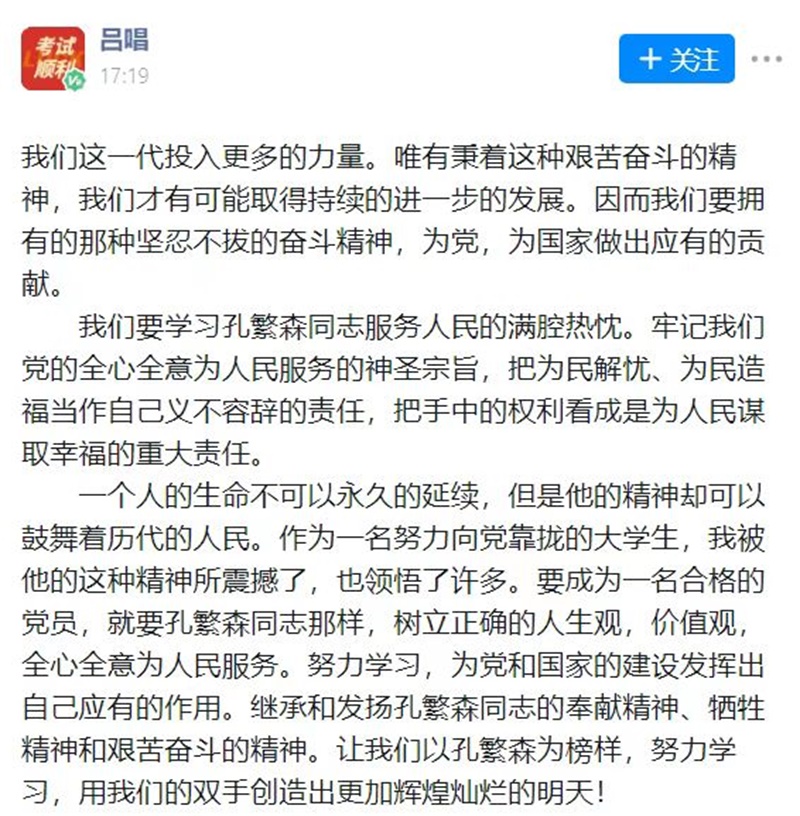 视频观看结束后,每位学生党员写下了自己心中的感悟。其中张龙姣提出,共产党员要有坚韧不拔的品格,克服困难、战胜困难;要坚定理想信念,树立正确的价值观、人生观和世界观;要以行动证明自己,对党忠诚,服务人民。其余学生党员也纷纷表示,学习孔繁森精神就是学习党的精神和理念的生动体现,要始终坚持不断进步,勤勤恳恳为人民服务。
