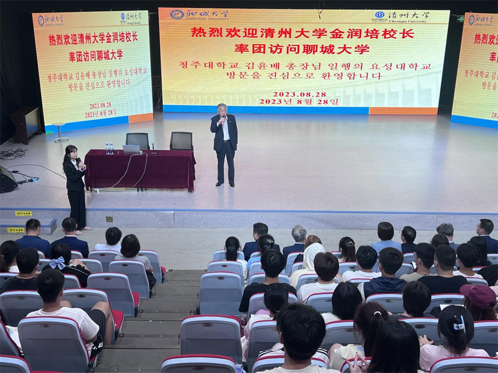 8月28日下午,韩国清州大学校长金润培、荣誉教授金荣哉、国际处处长权赫宰和国际处合作办学负责人朴秀贞一行来到西校区综合实验楼演播厅参加中韩合作办学专业师生交流见面会活动。陪同参加活动的还有我校党委常委、副书记房增福,国际处副处长钱润池,蜜桃直播