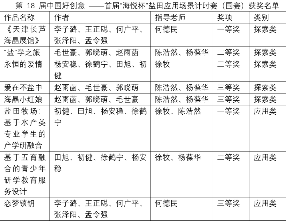 的参赛队伍凭借出色的创意、精湛的技术和扎实的专业素养在众多参赛作品中脱颖而出,斩获国家级一等奖2项,二等奖3项,三等奖3项。其中,由何德民指导的作品《天津长芦海晶展馆》与徐牧、陈浩然指导的作品《盐田牧场:基于水产类专业学生的产学研融合》荣获国家级一等奖。