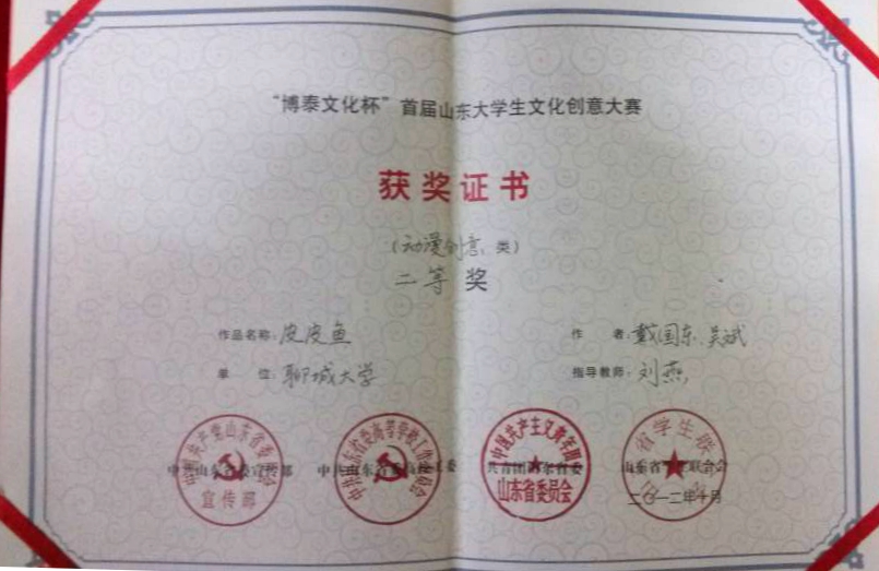 戴国东、吴斌,“博泰文化杯”首届山东大学生文化创意大赛动漫创意类二等奖