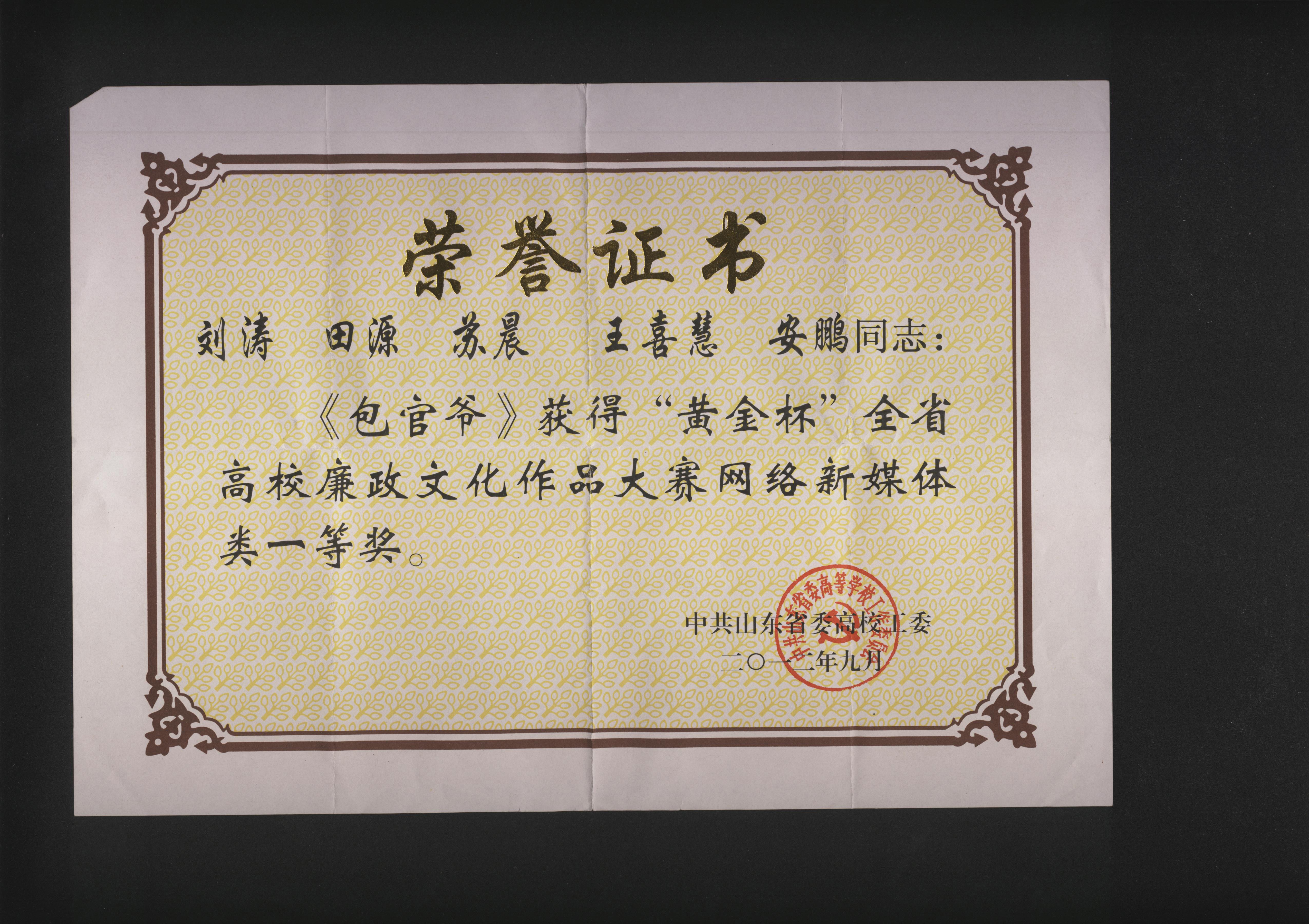 刘涛、田源、苏晨、王喜慧、安鹏,“黄金杯”全省高校廉政文化作品大赛网络新媒体类一等奖