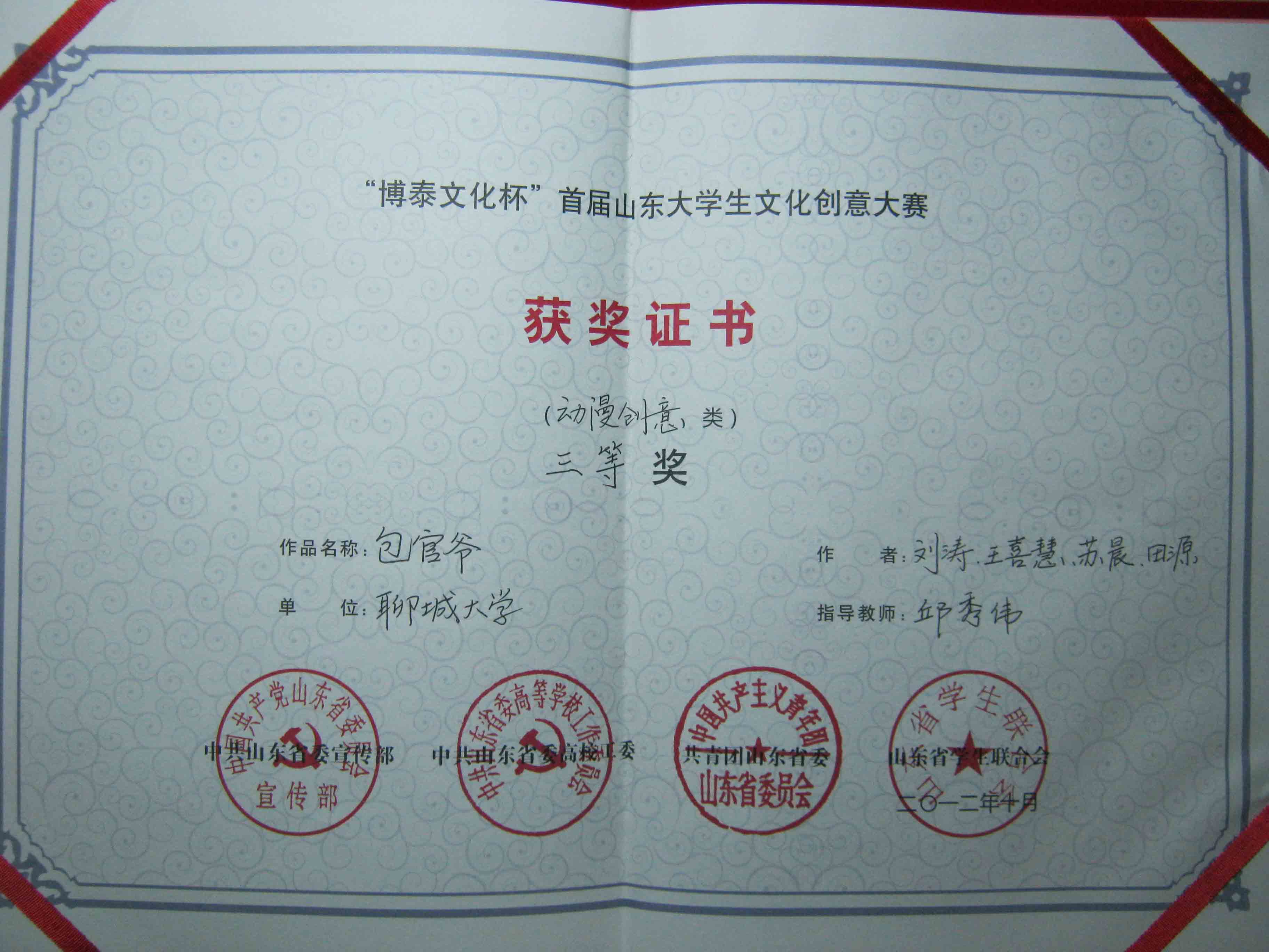 刘涛、王喜慧、苏晨、田源,“泰博文化杯”首届山东大学生文化创意大赛动漫创意类三等奖