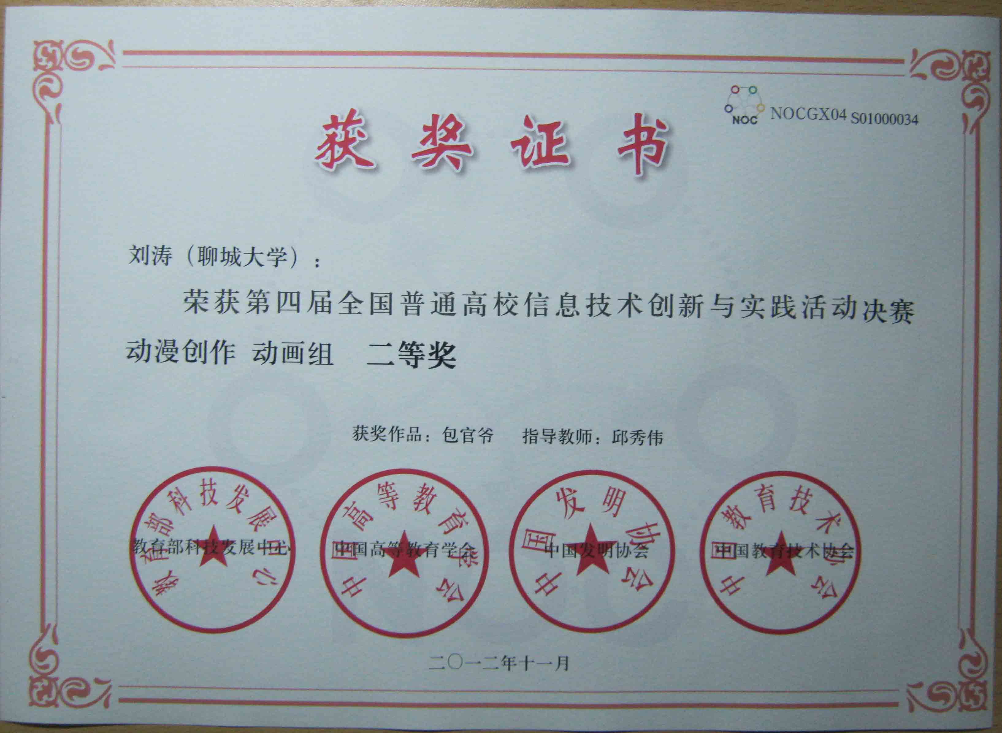 刘涛,第四届全国普通高校信息技术创新与实践活动决赛动漫创作动画组二等奖