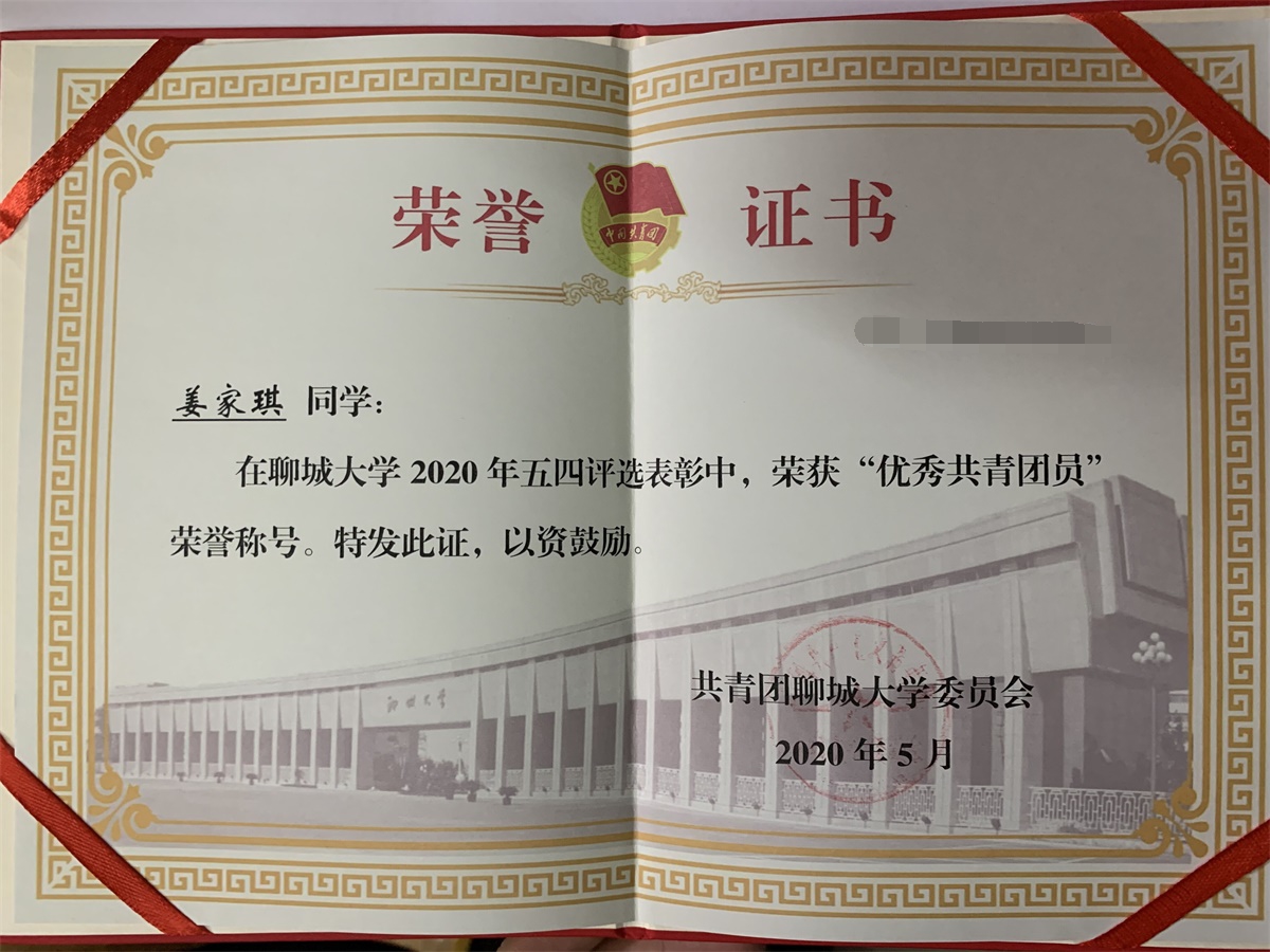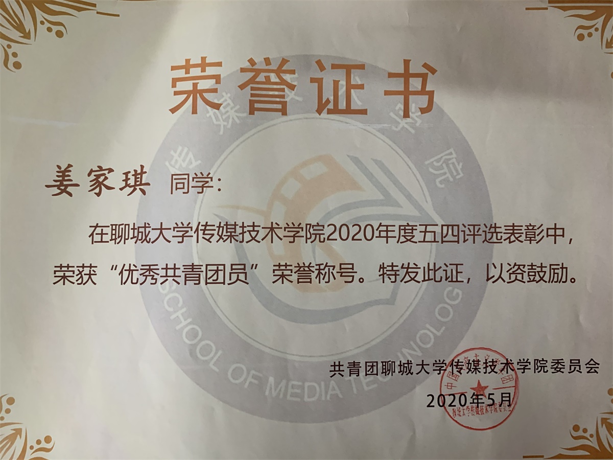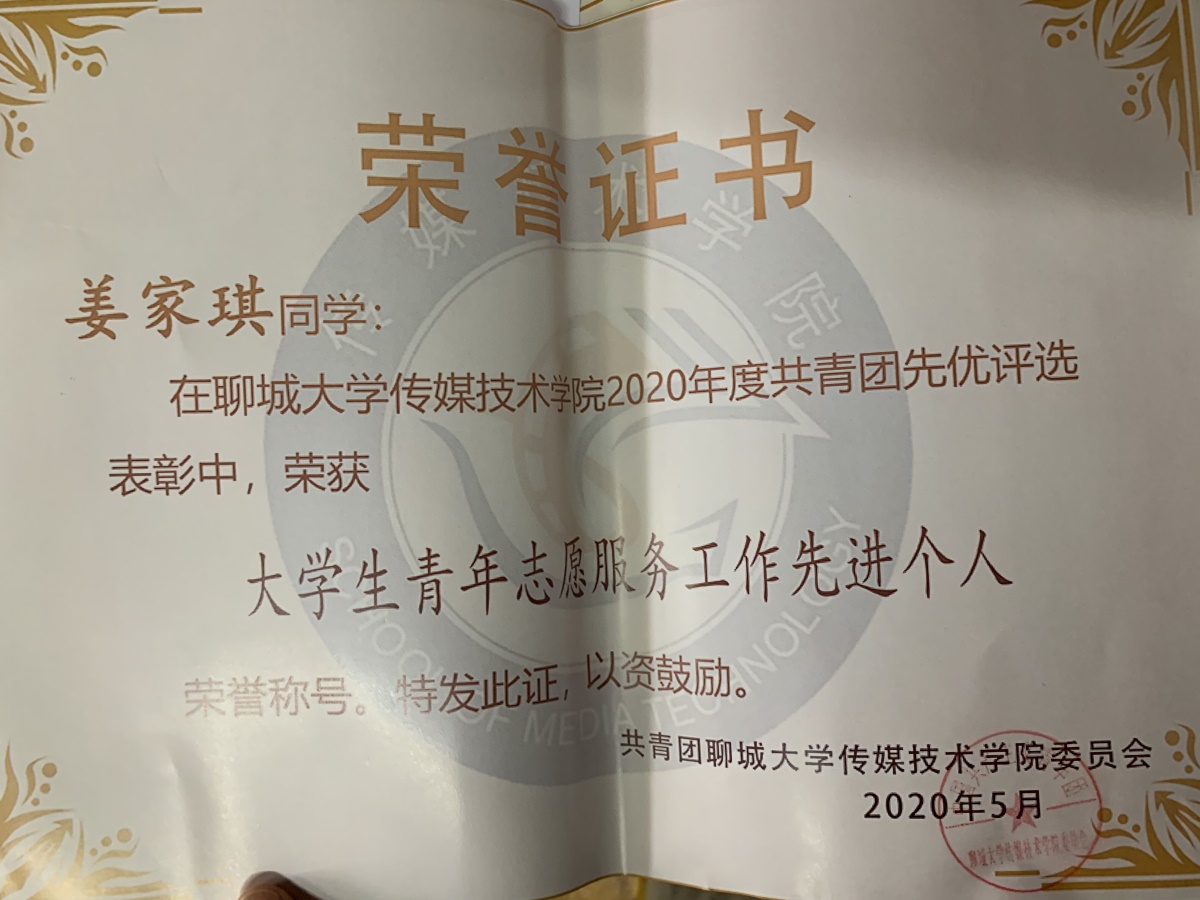 姜家琪获得2020年大学生青年志愿服务工作先进个人