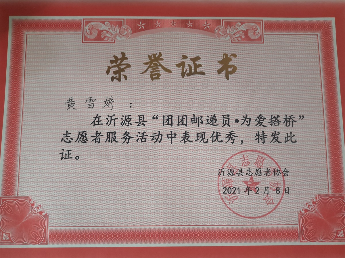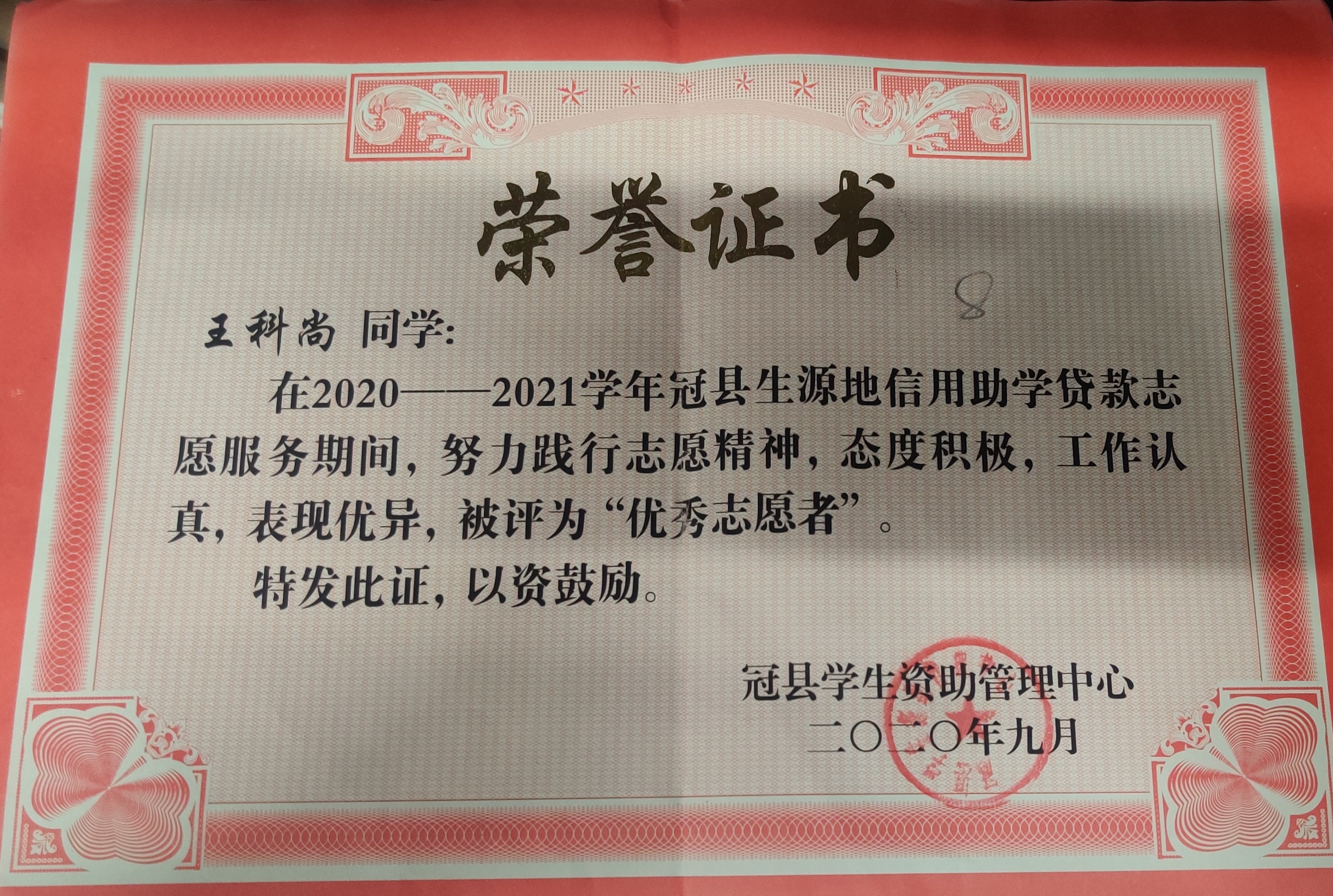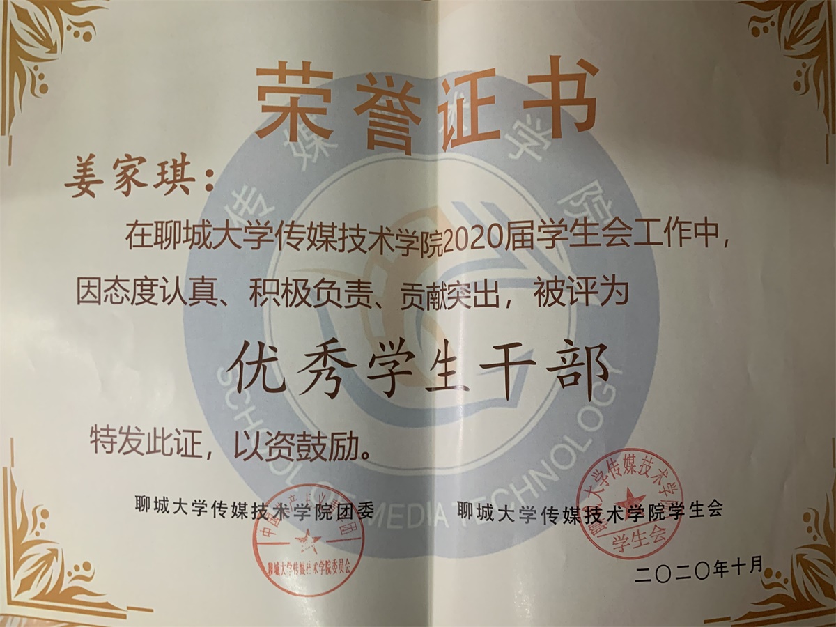 姜家琪获得2020年大学生青年志愿服务工作先进个人