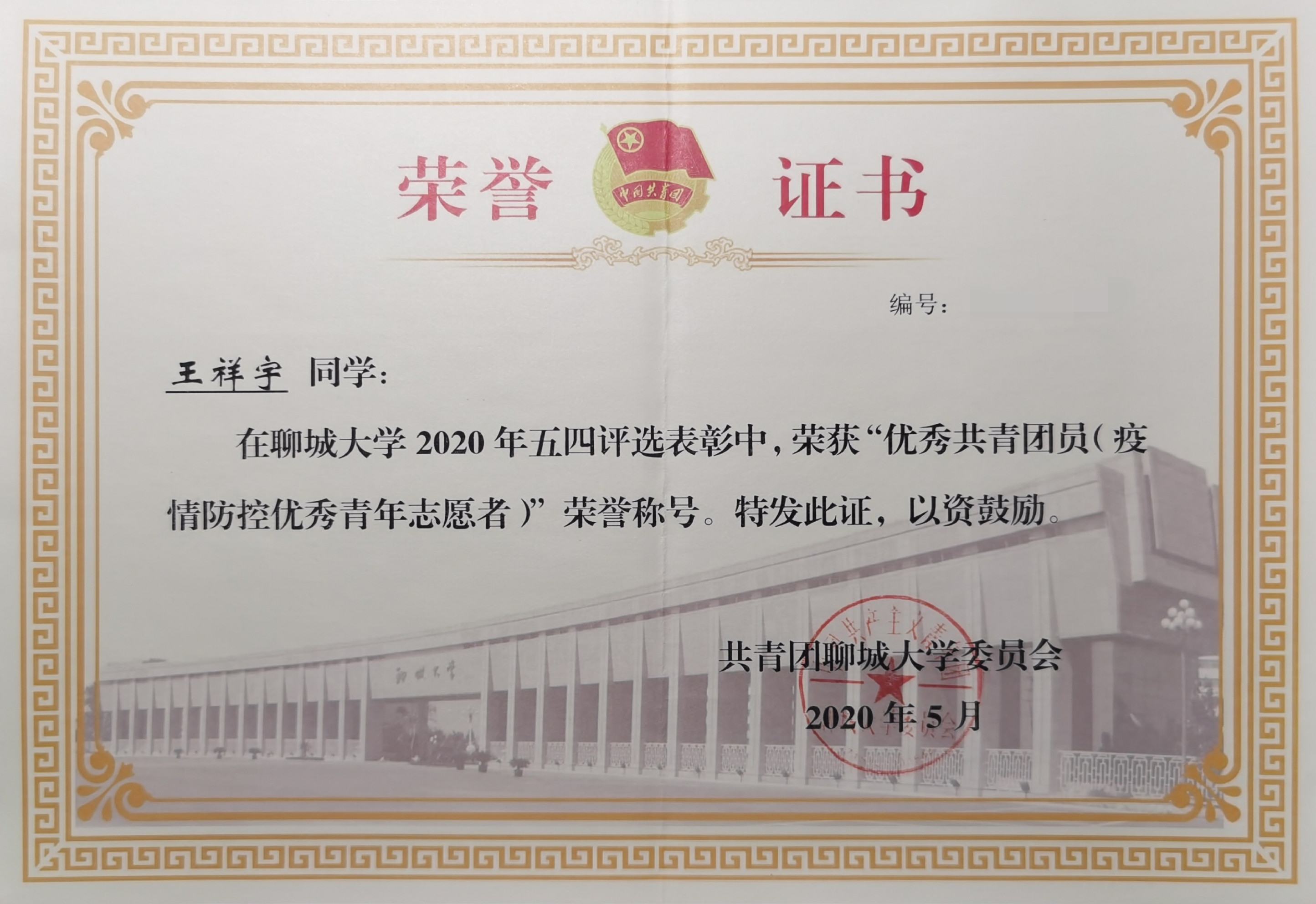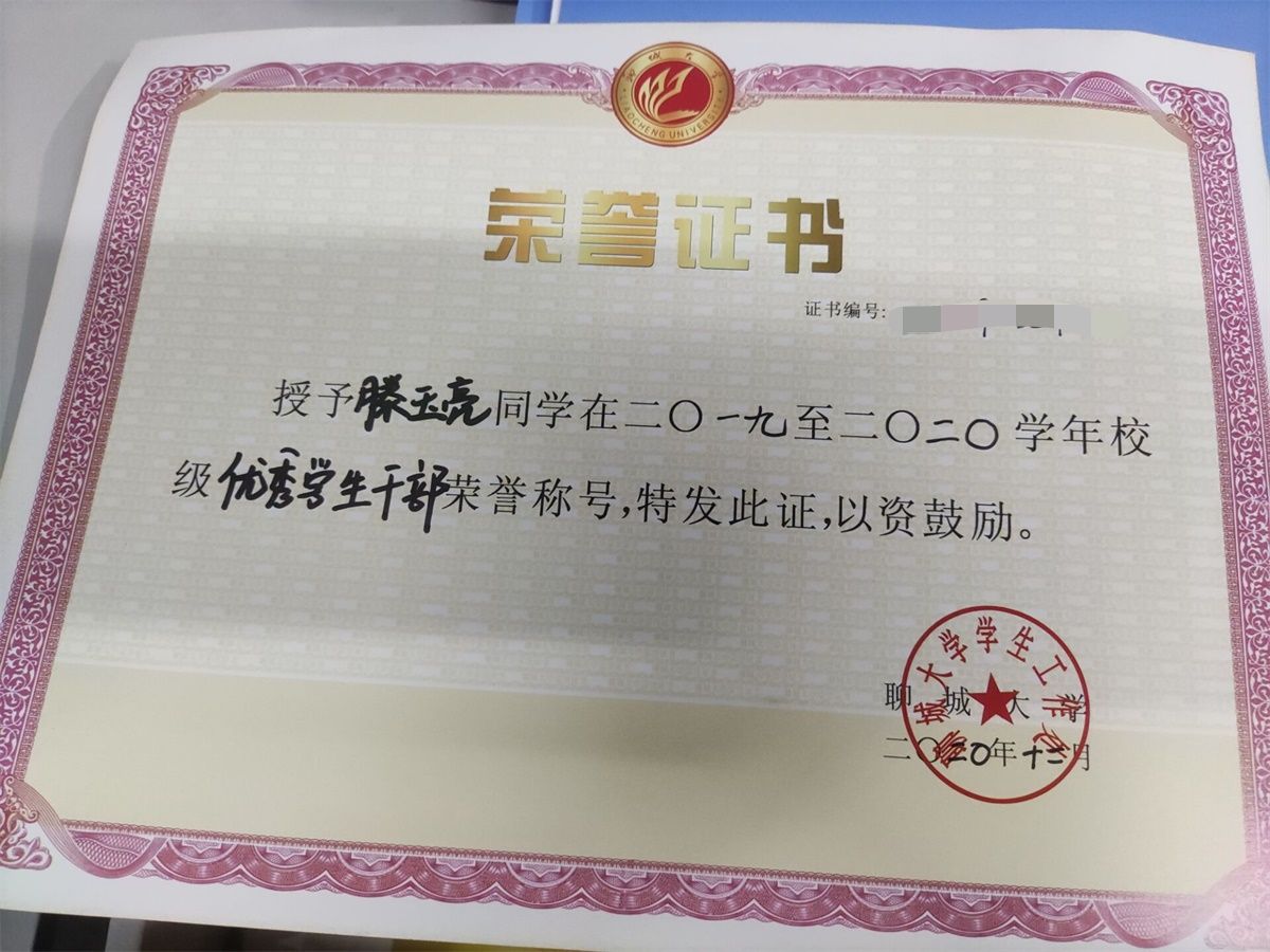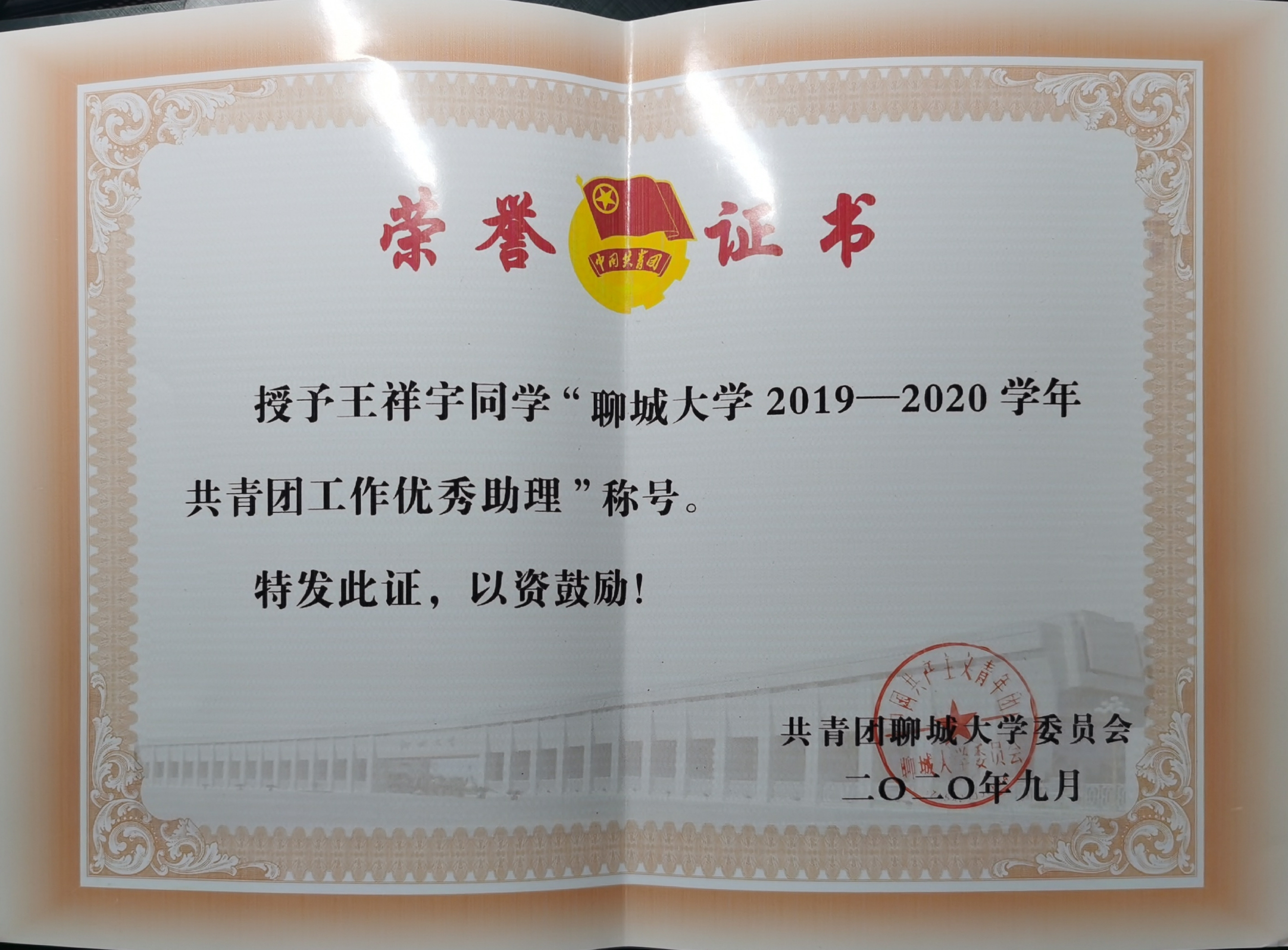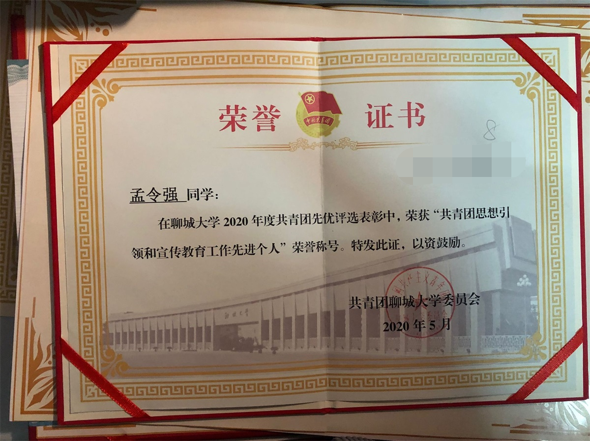 孟令强获得校级“共青团思想引领和宣传教育工作先进个人称号