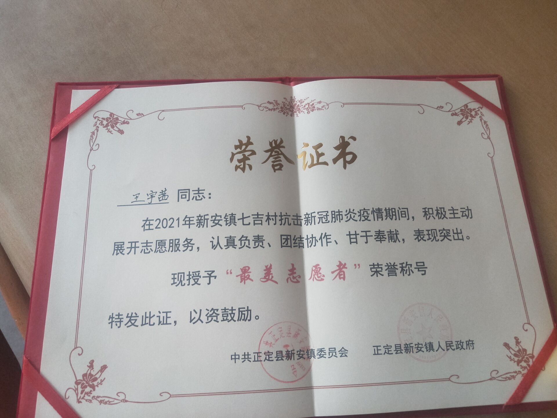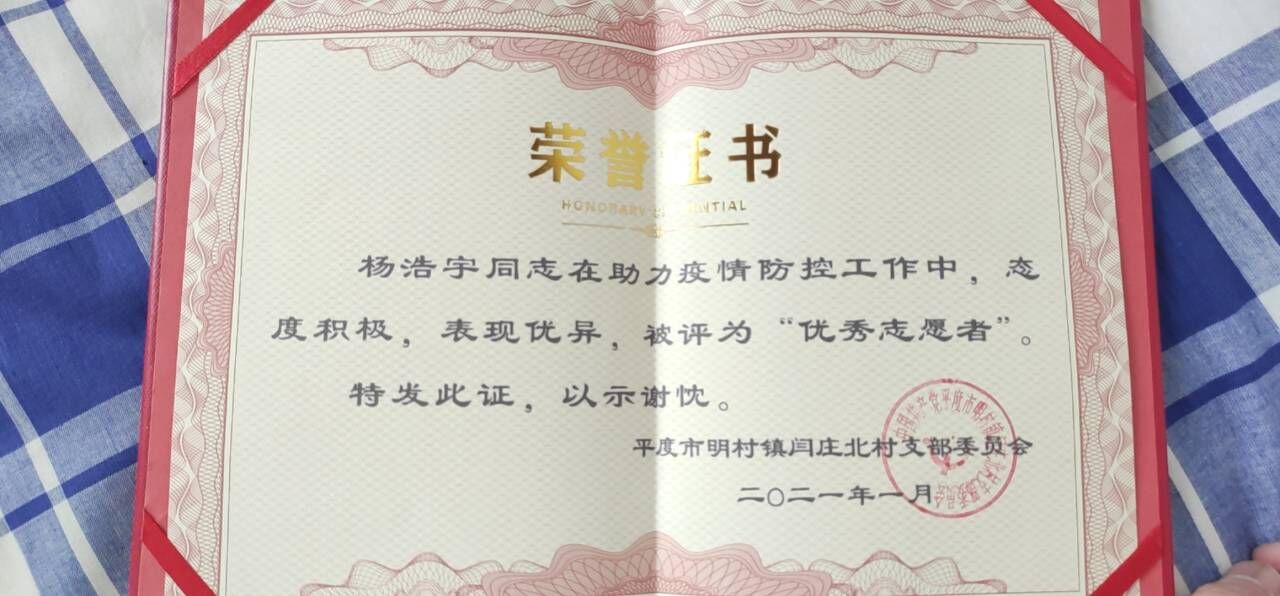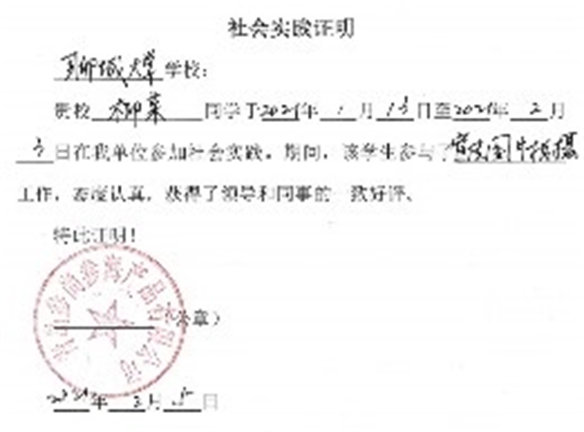 张玉苗获得2021嘉祥县万张街道“青春无悔 共同战疫”大学生社会实践证明