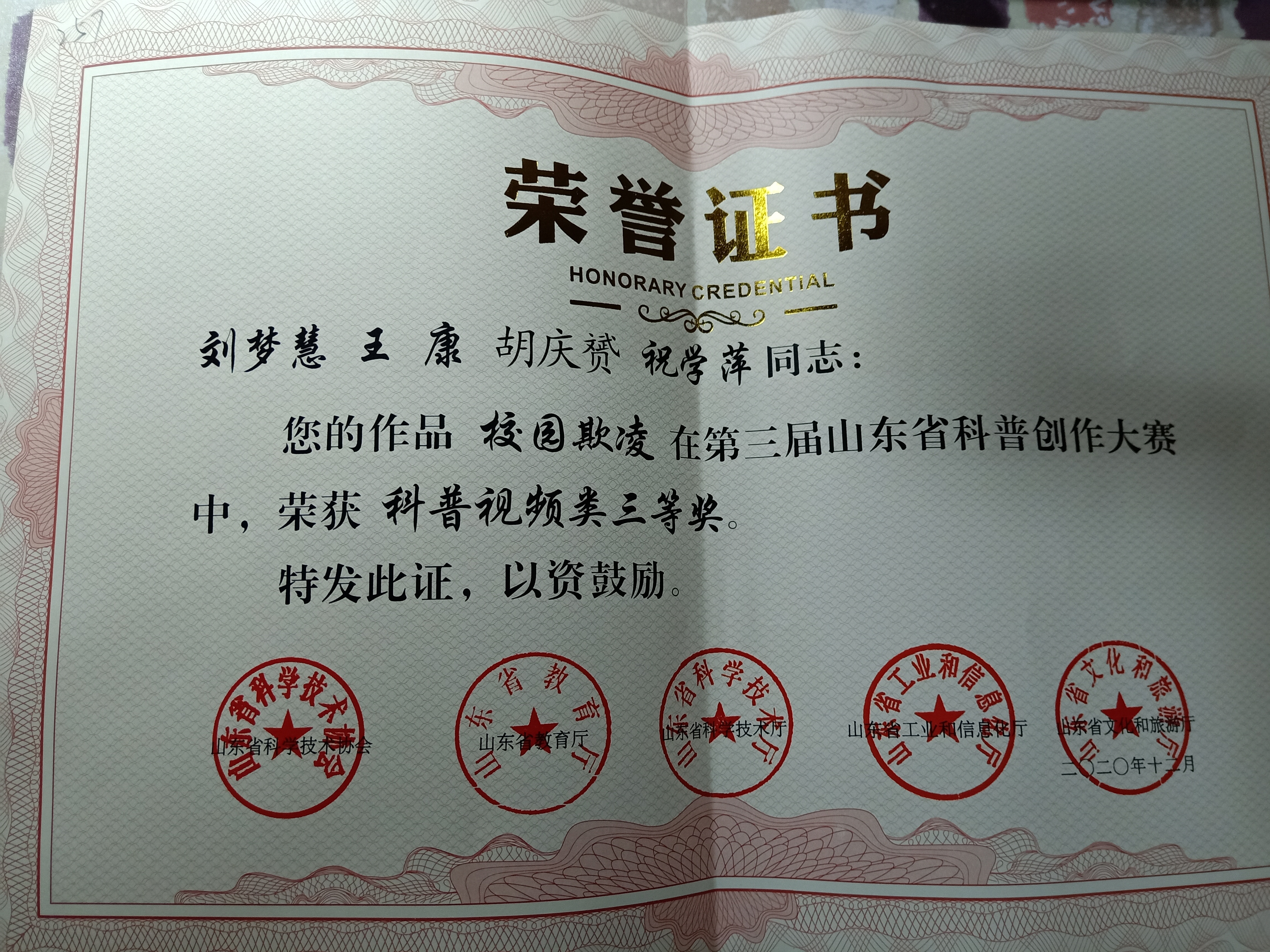 祝学萍作品《校园欺凌》在第三届山东省科普创作大赛获得科普视频类三等奖