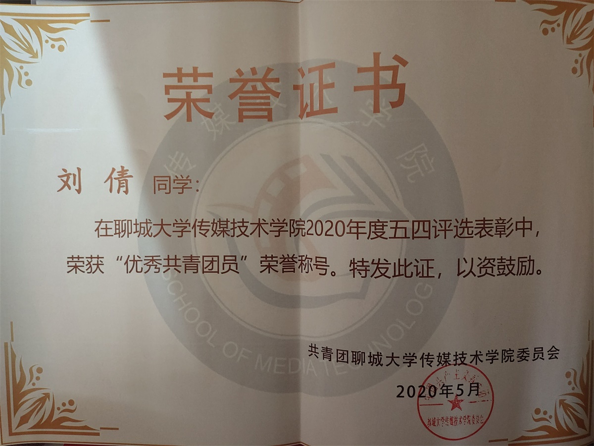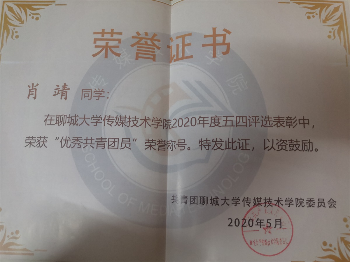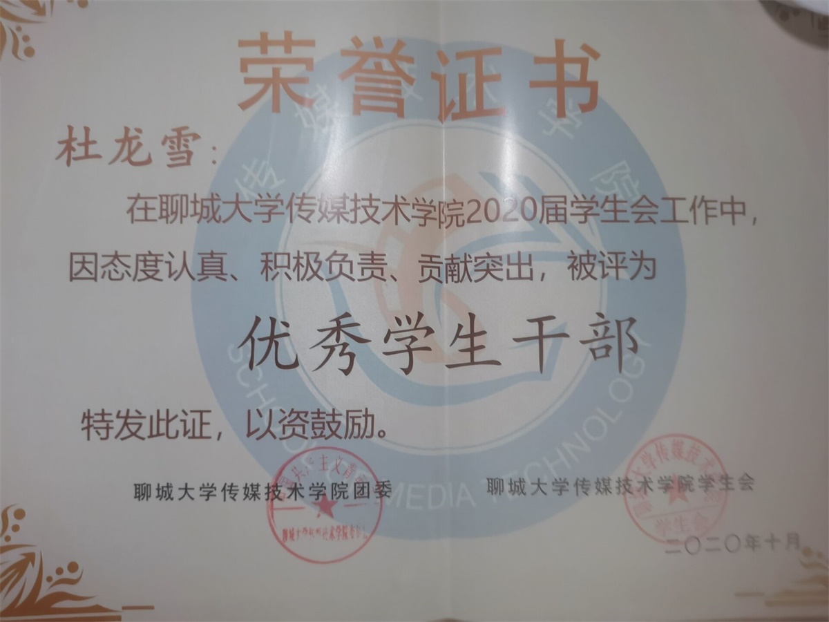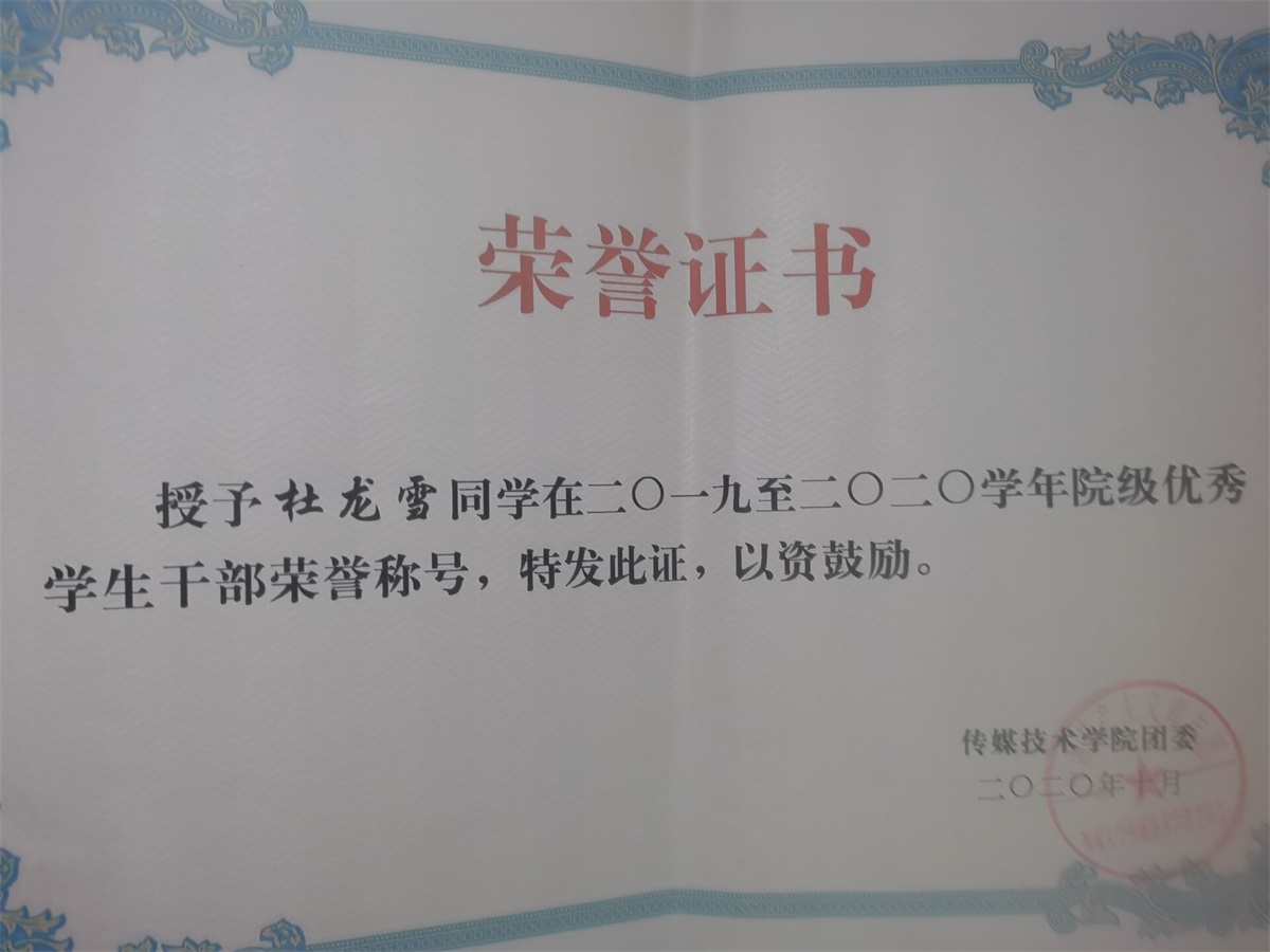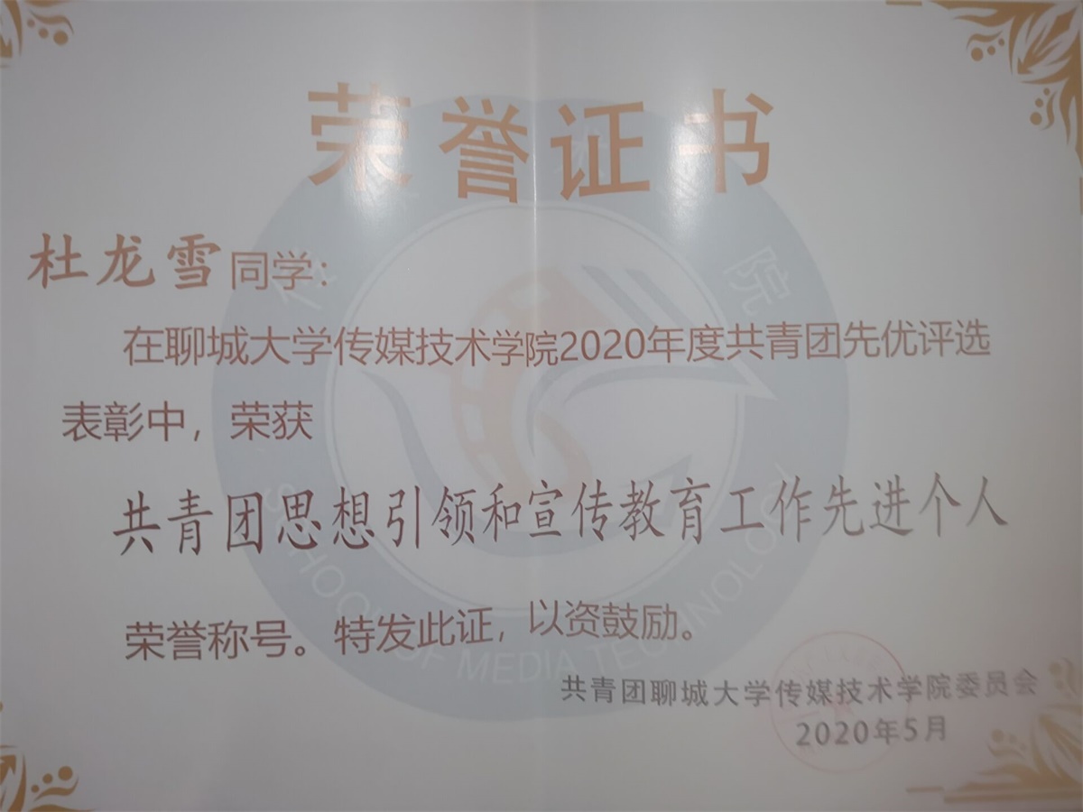 杜龙雪获得2020年度共青团思想引领和宣传教育工作先进个人称号