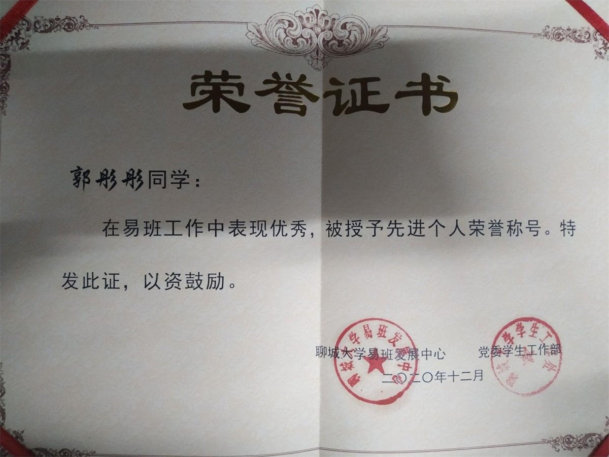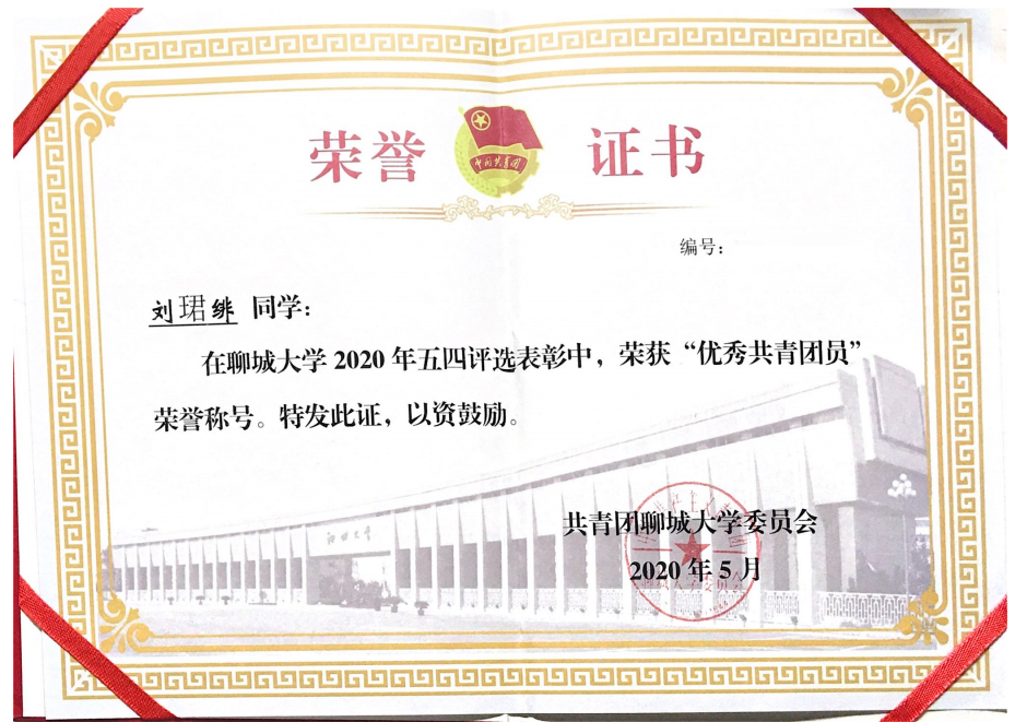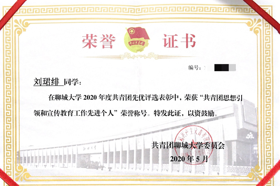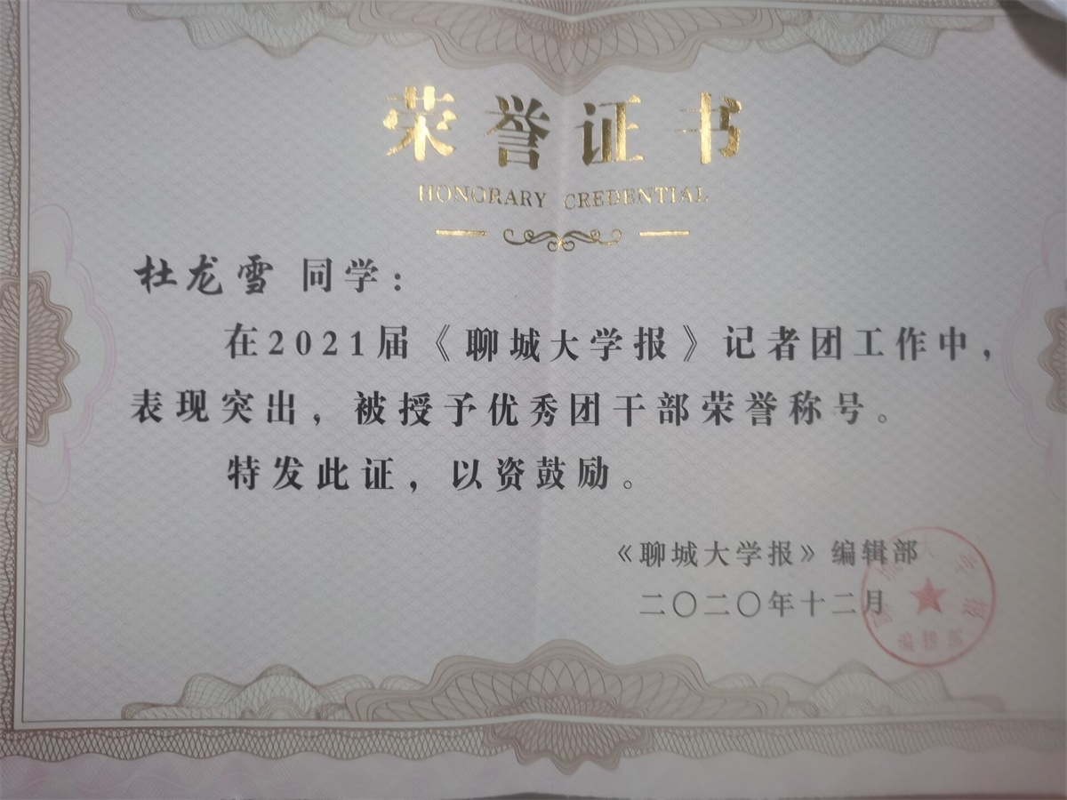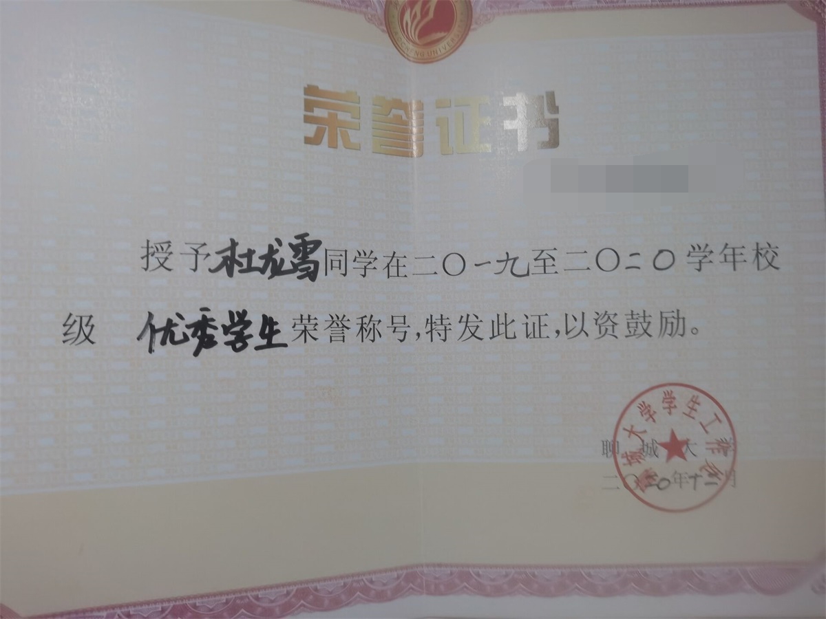 杜龙雪获得2020年度共青团思想引领和宣传教育工作先进个人称号