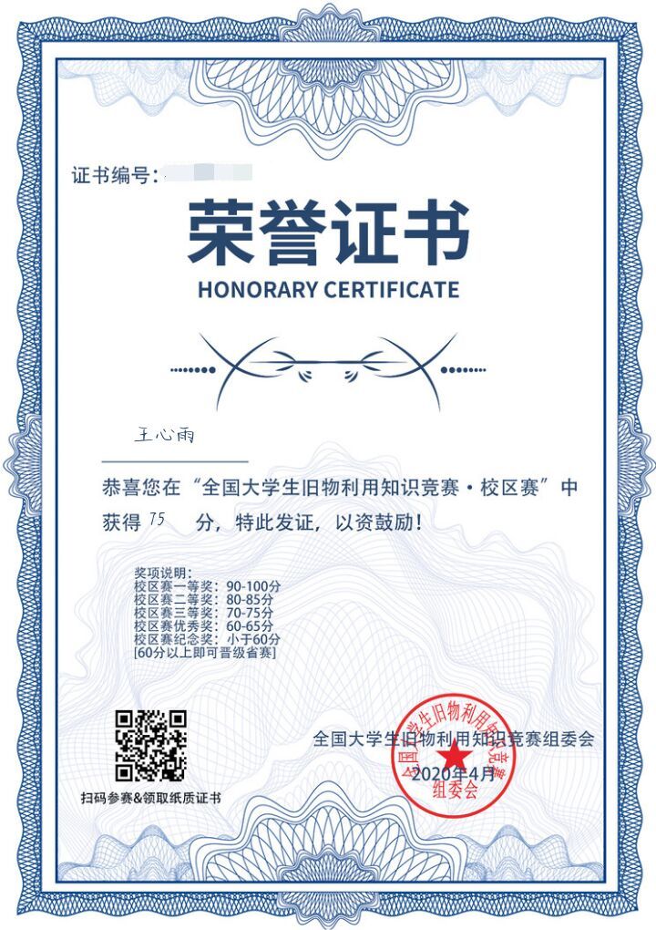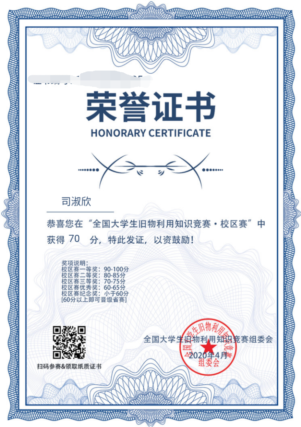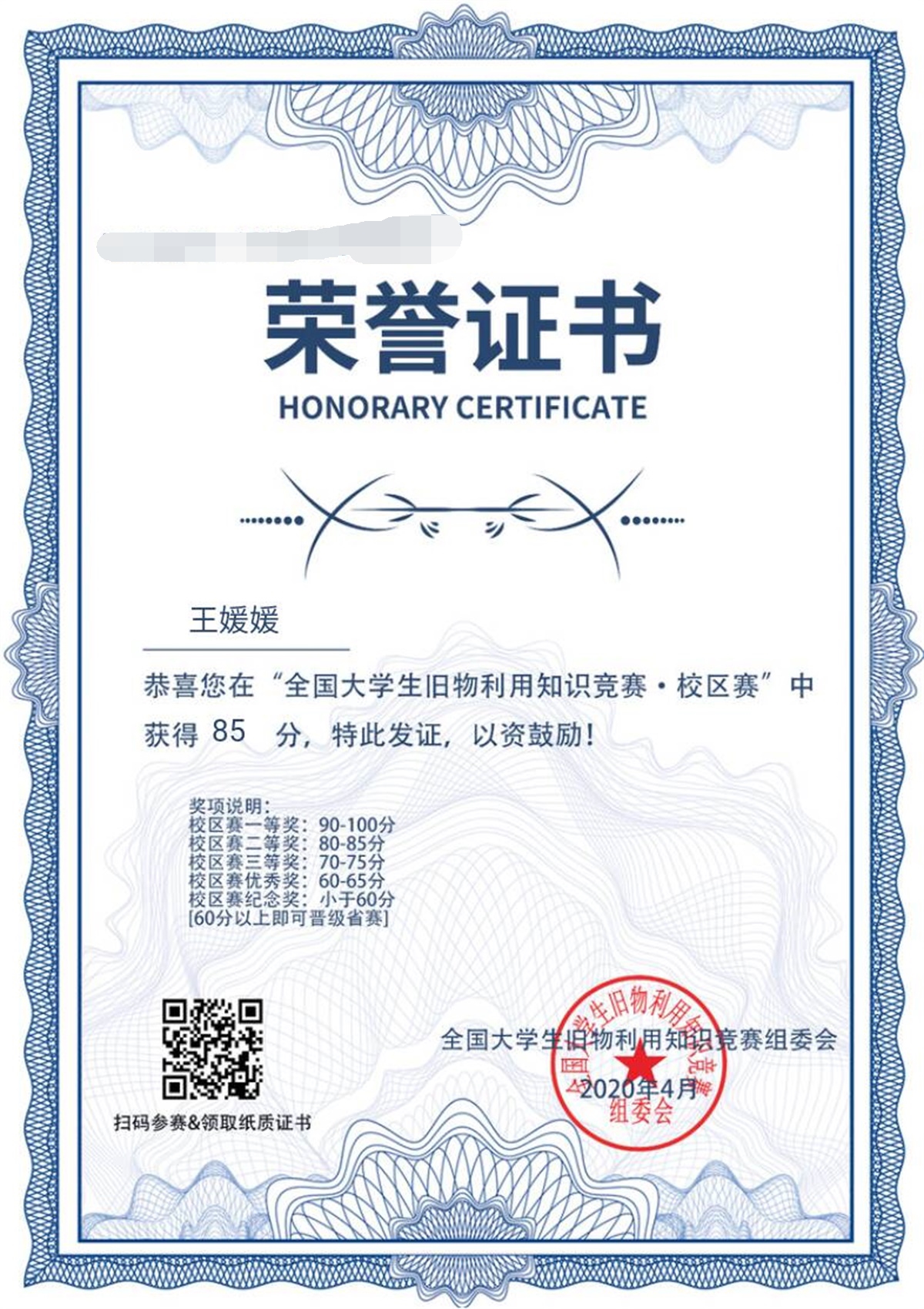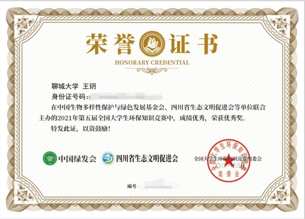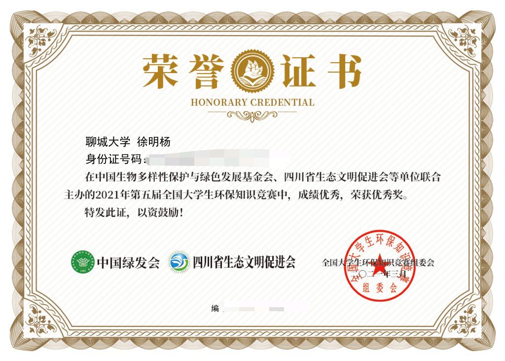 葛戈,2020年第四届全国大学生环保知识竞赛优秀奖