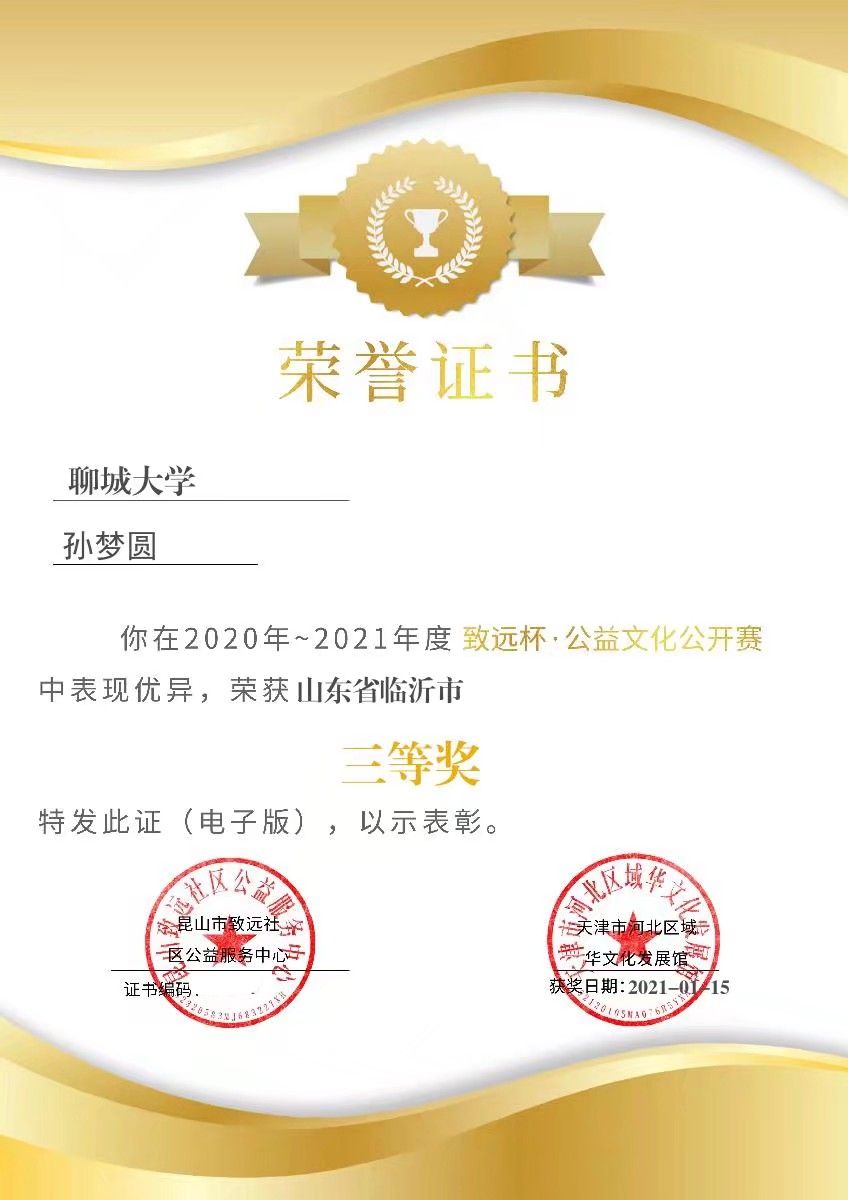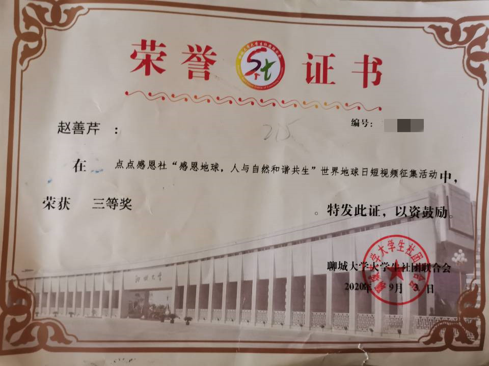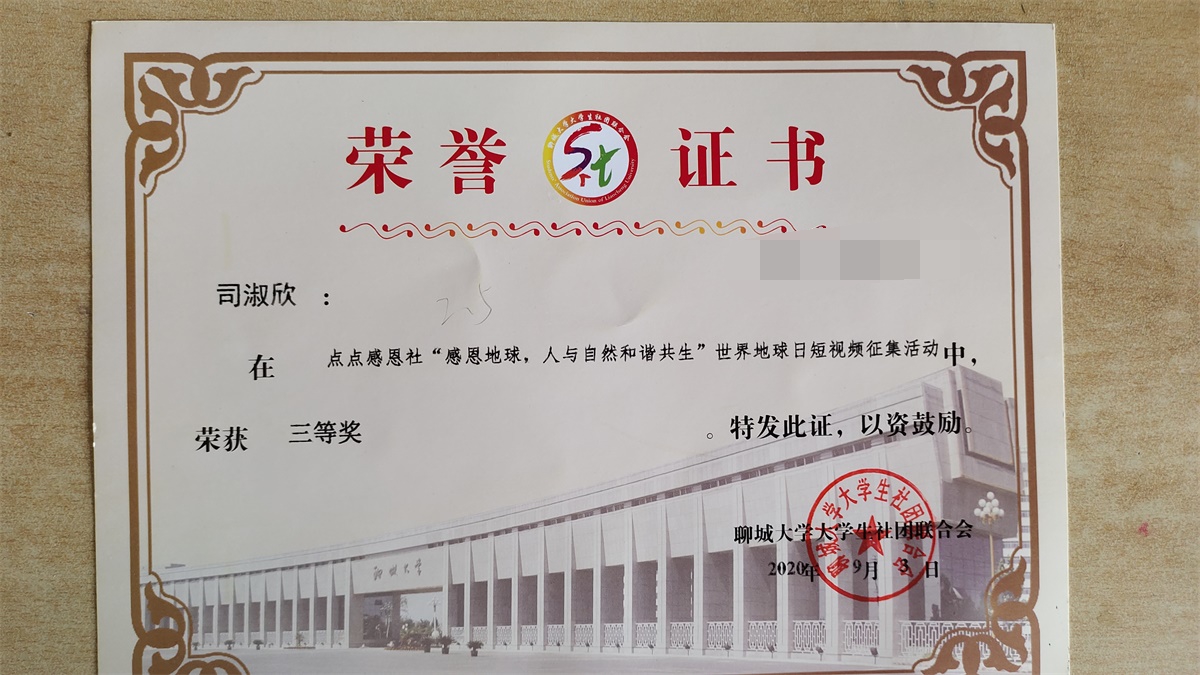 司淑欣荣获感恩地球人与自然和谐共生视频征集活动三等奖