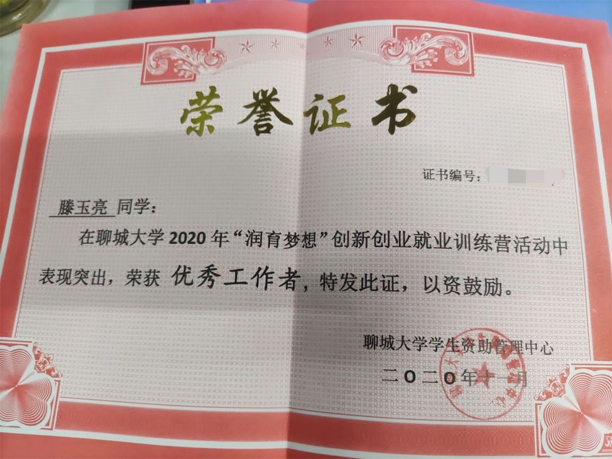 滕玉亮获得2020年“润与梦想”创新创业就业训练荣获优秀工作者