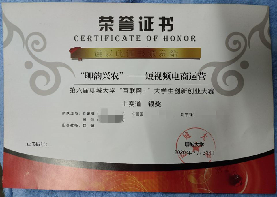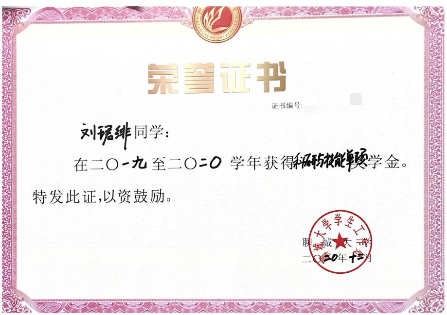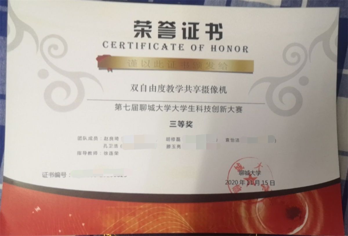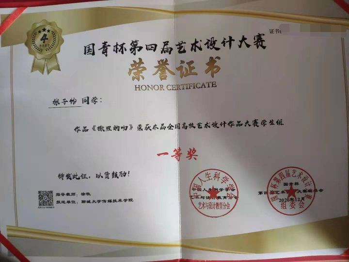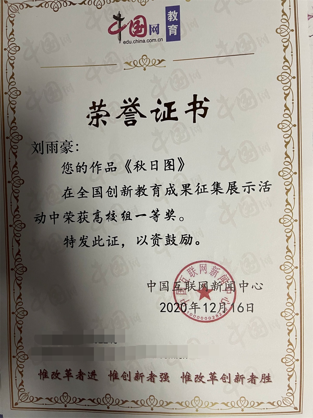 刘雨豪,2020年全国创新教育成果征集活动高校一等奖