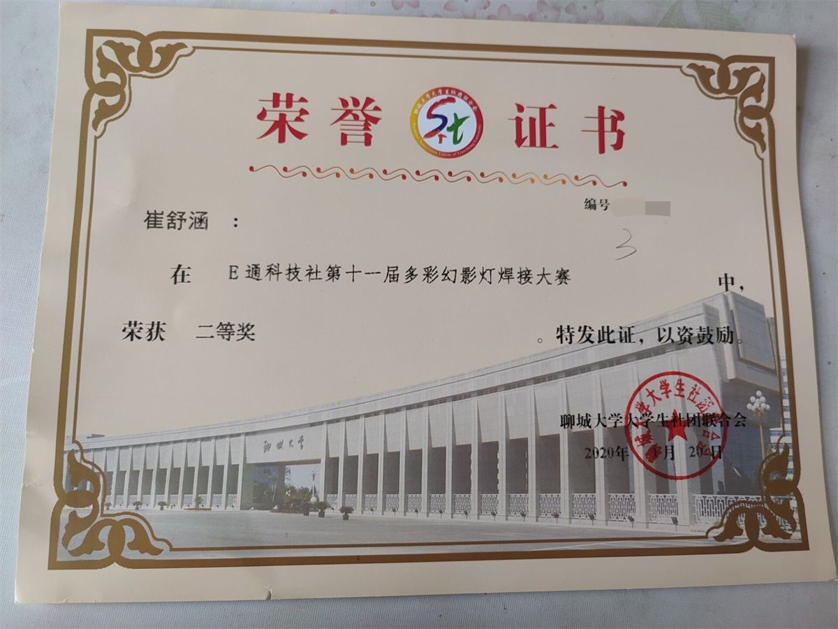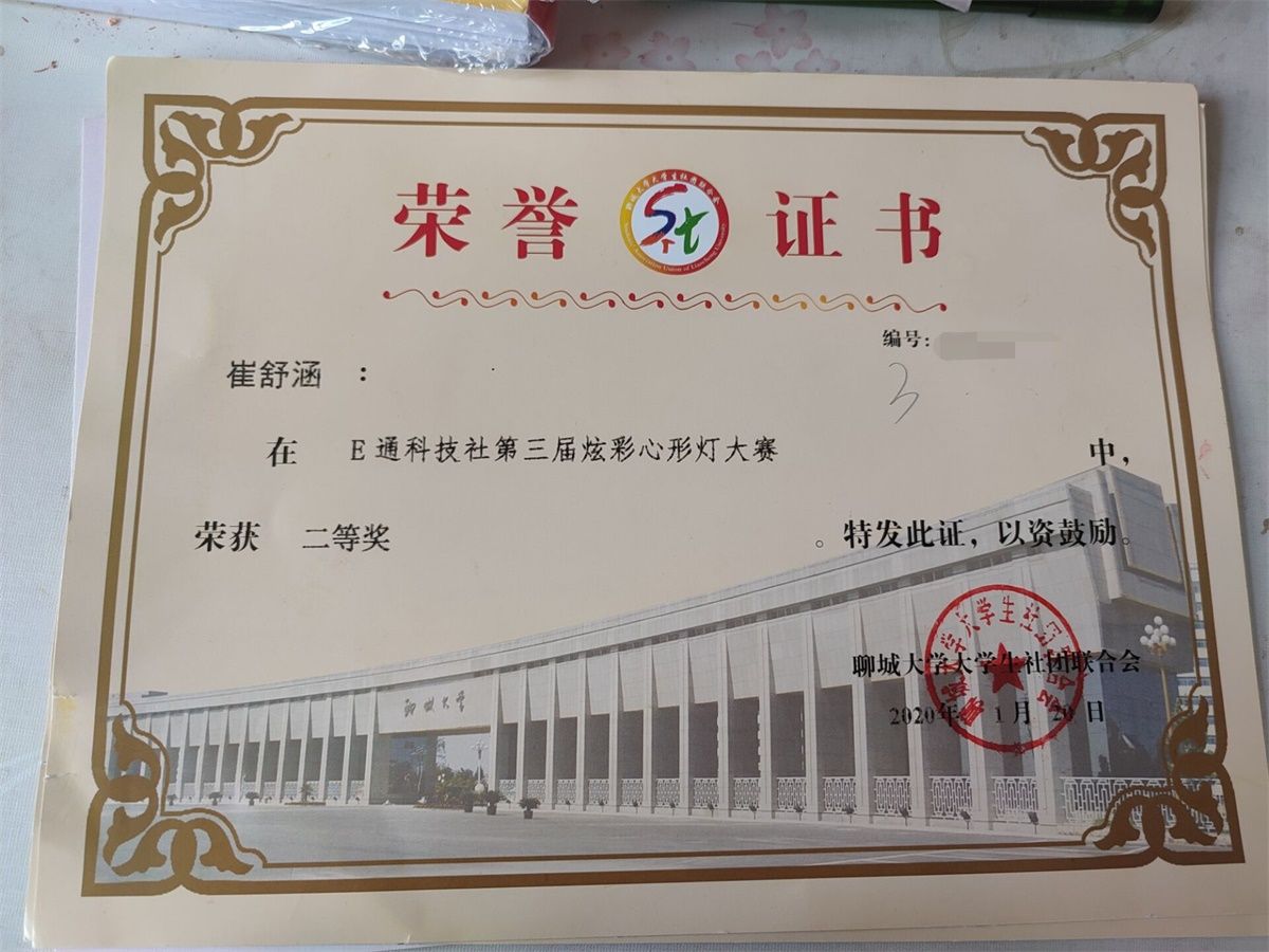 崔舒涵获得E通科技社第十一届多彩幻影灯焊接大赛二等奖
