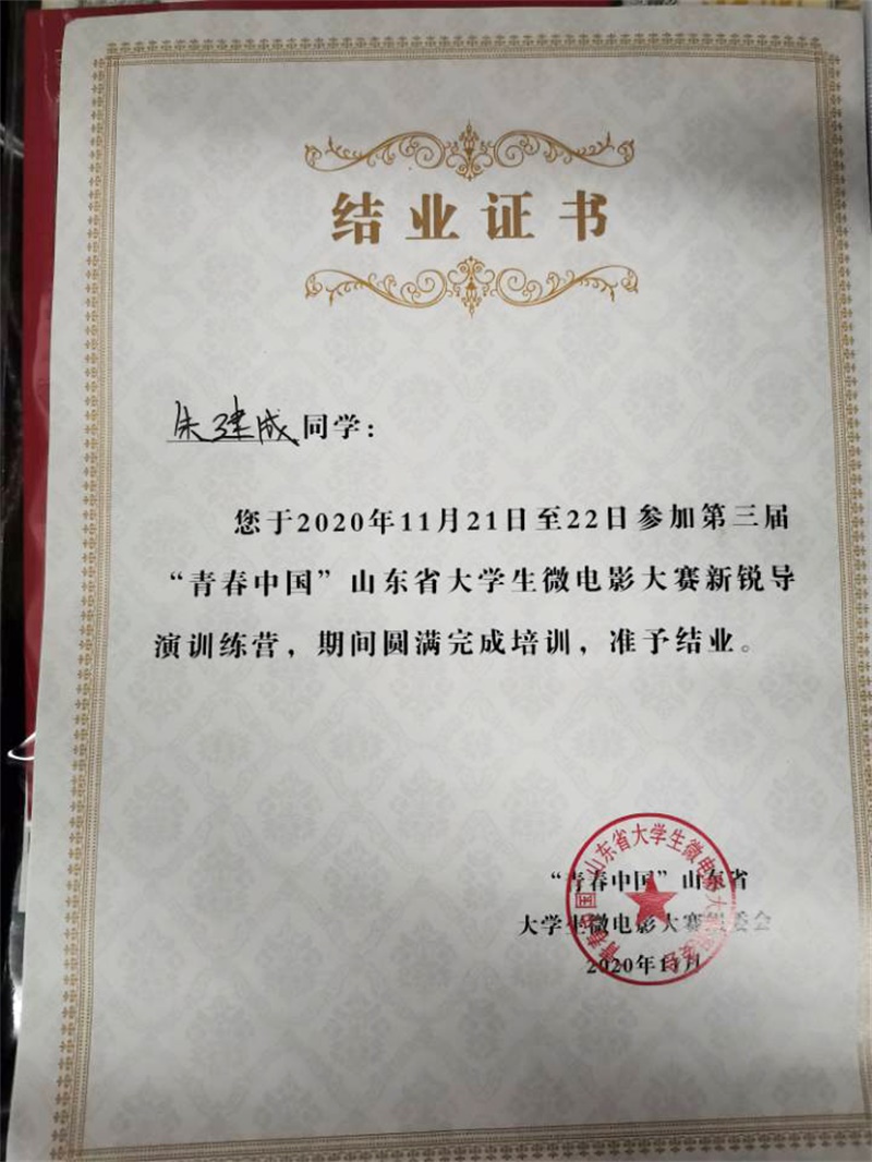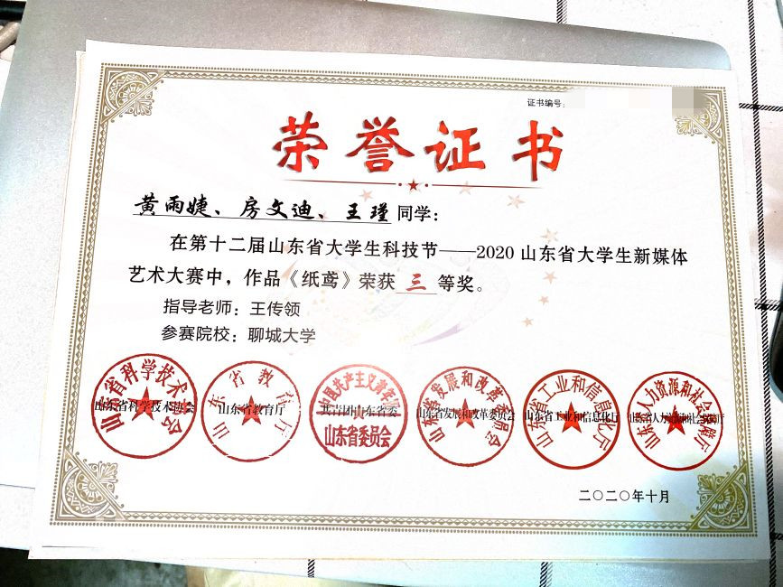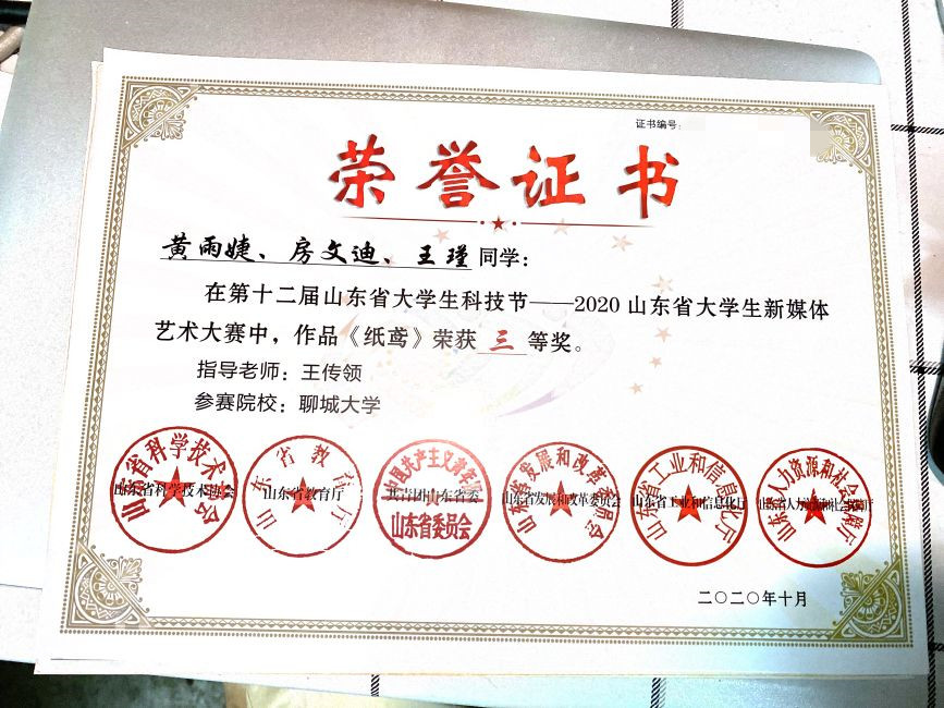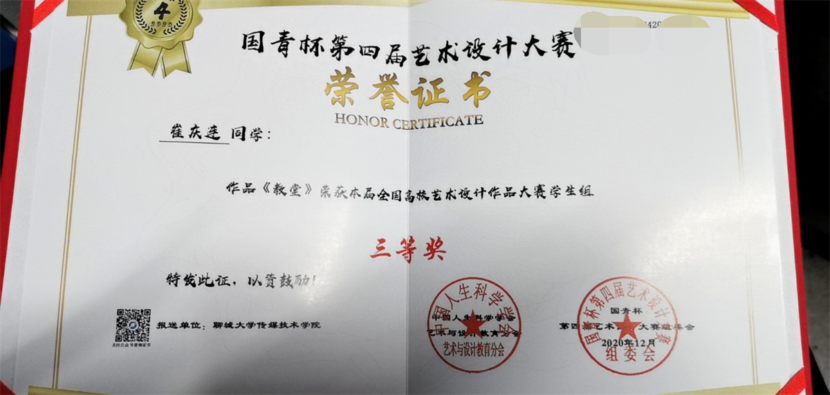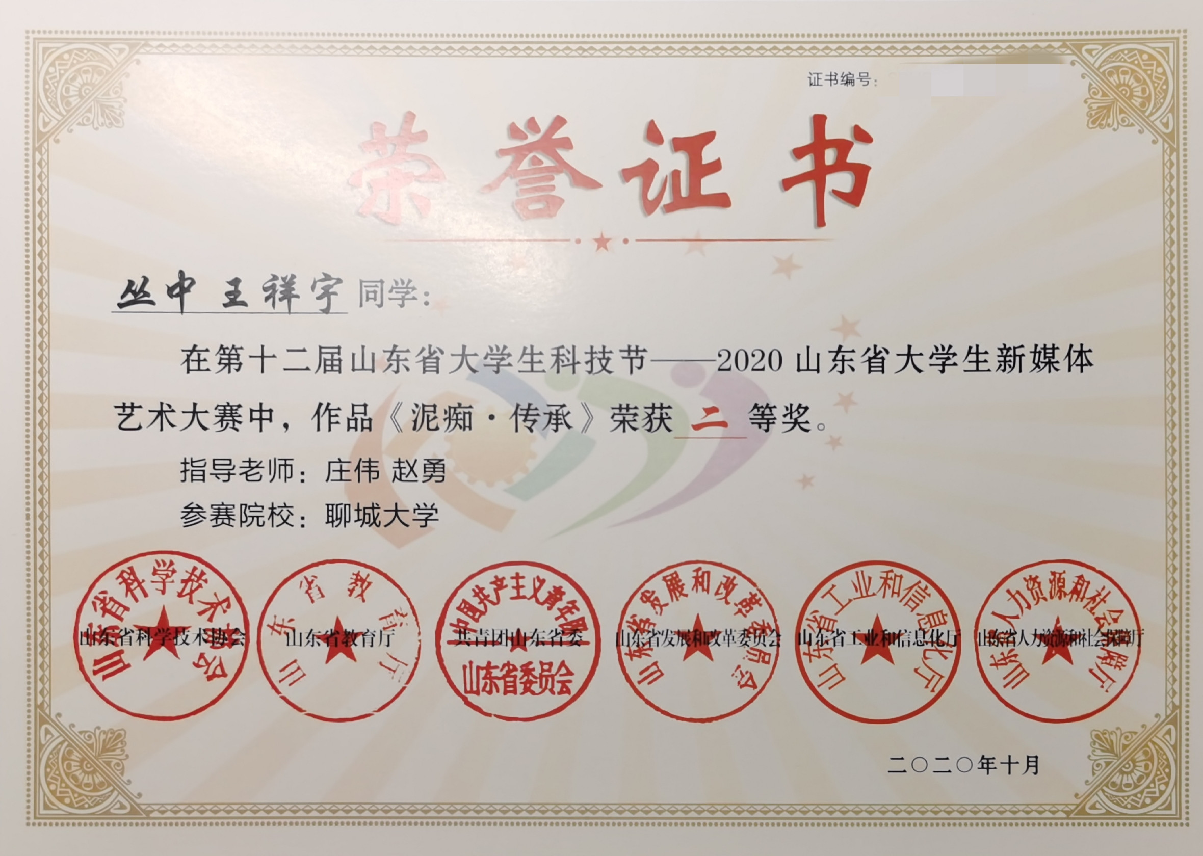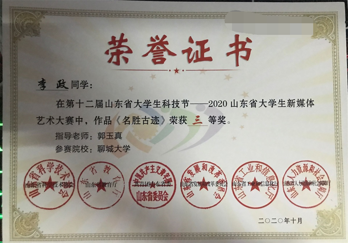 李政的《名胜古迹》在2020山东省大学生新媒体艺术大赛中获得三等奖