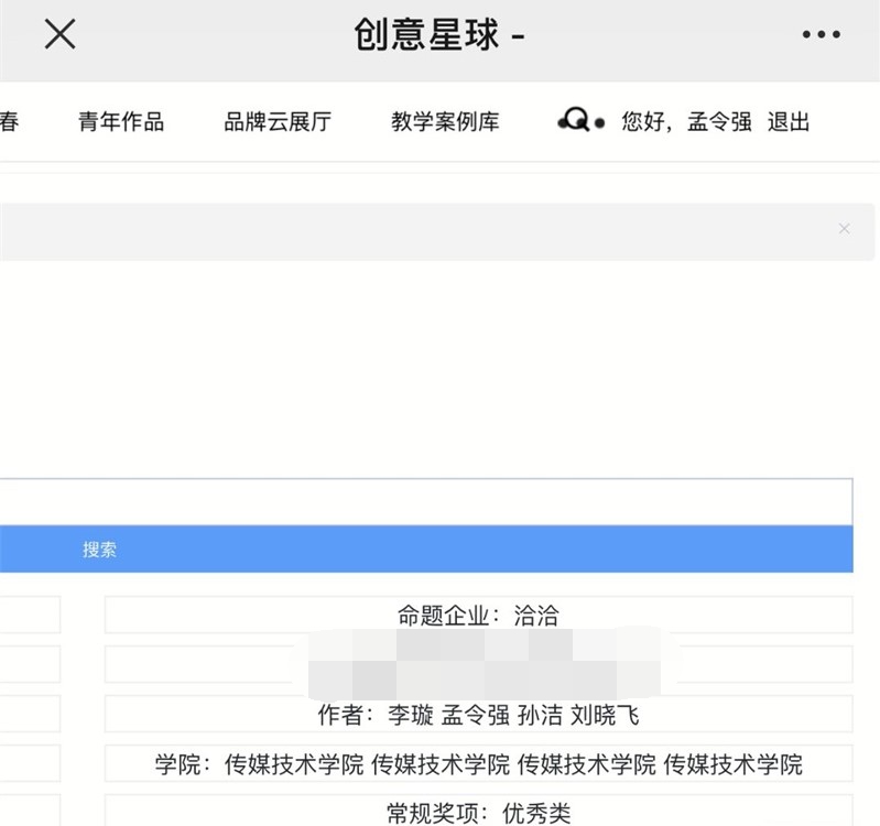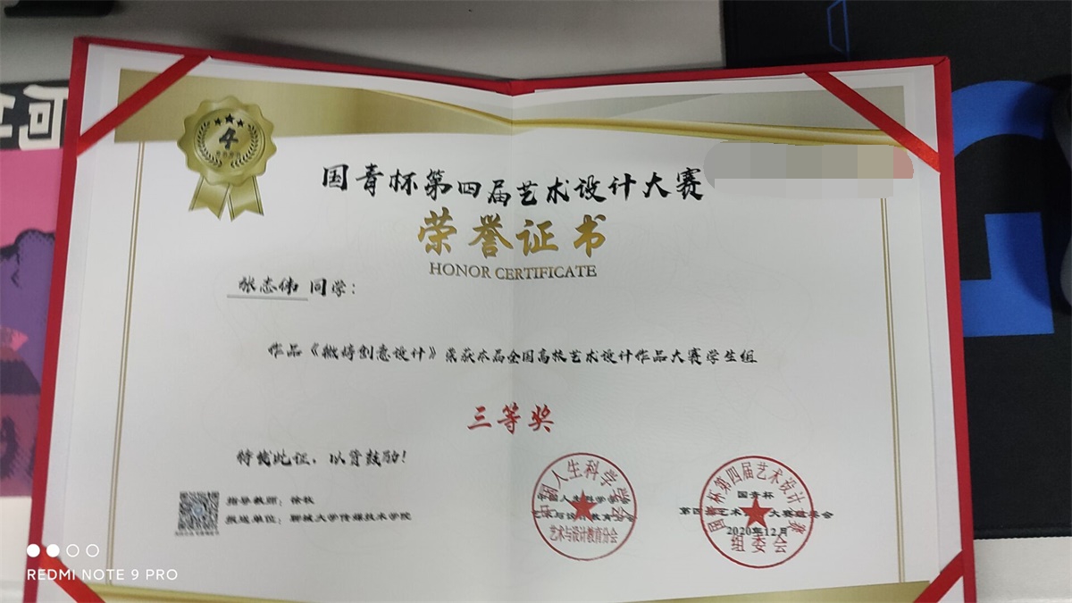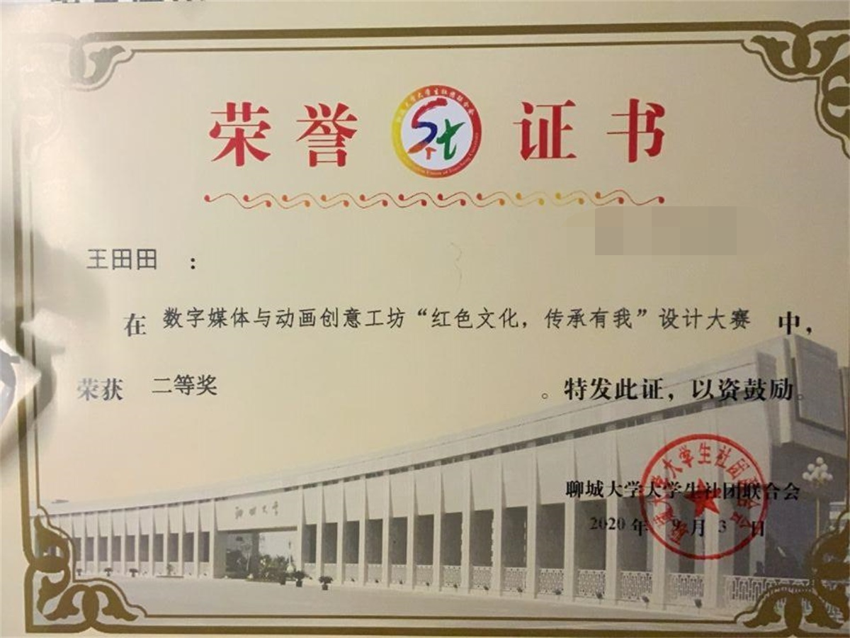 王田田在数字媒体与动画创意工坊”红色文化 传承有我“设计大赛获得二等奖