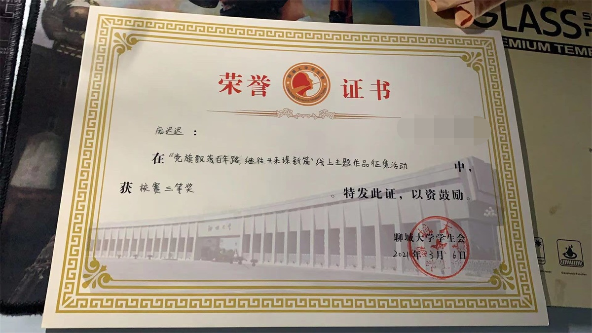 庞迟迟在“党旗飘荡百年路,继往开来谋新篇”作品征集活动获得三等奖