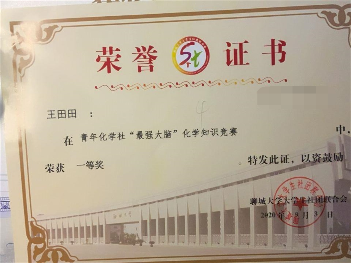 王田田在青年化学社”最强大脑“化学知识竞赛获得一等奖