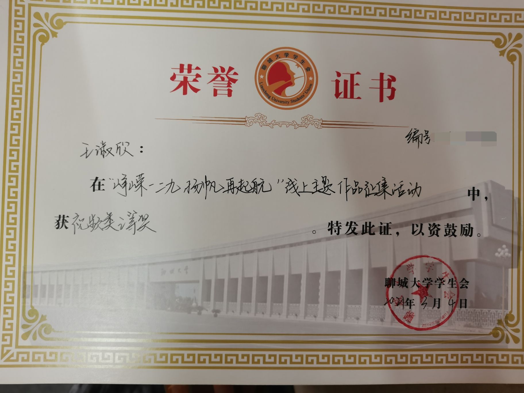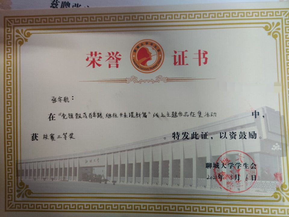 张字航,“党旗飘荡百年路,继往开来谋新篇”线上主题作品征集活动校赛三等奖