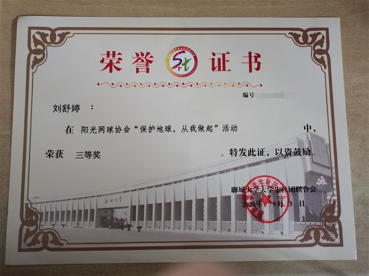 刘舒婷,阳光网球协会“保护地球,从我做起”活动三等奖