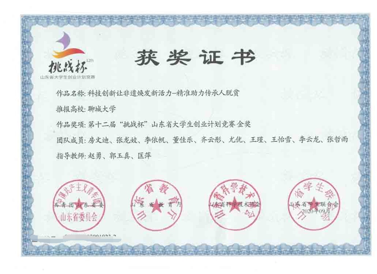 房文迪、张龙姣、李依帆、董佳乐、齐云彤、尤优、王瑾、 王怡雪、李云龙、张哲雨获第十二届“挑战杯”山东省大学生创业计划竞赛金奖