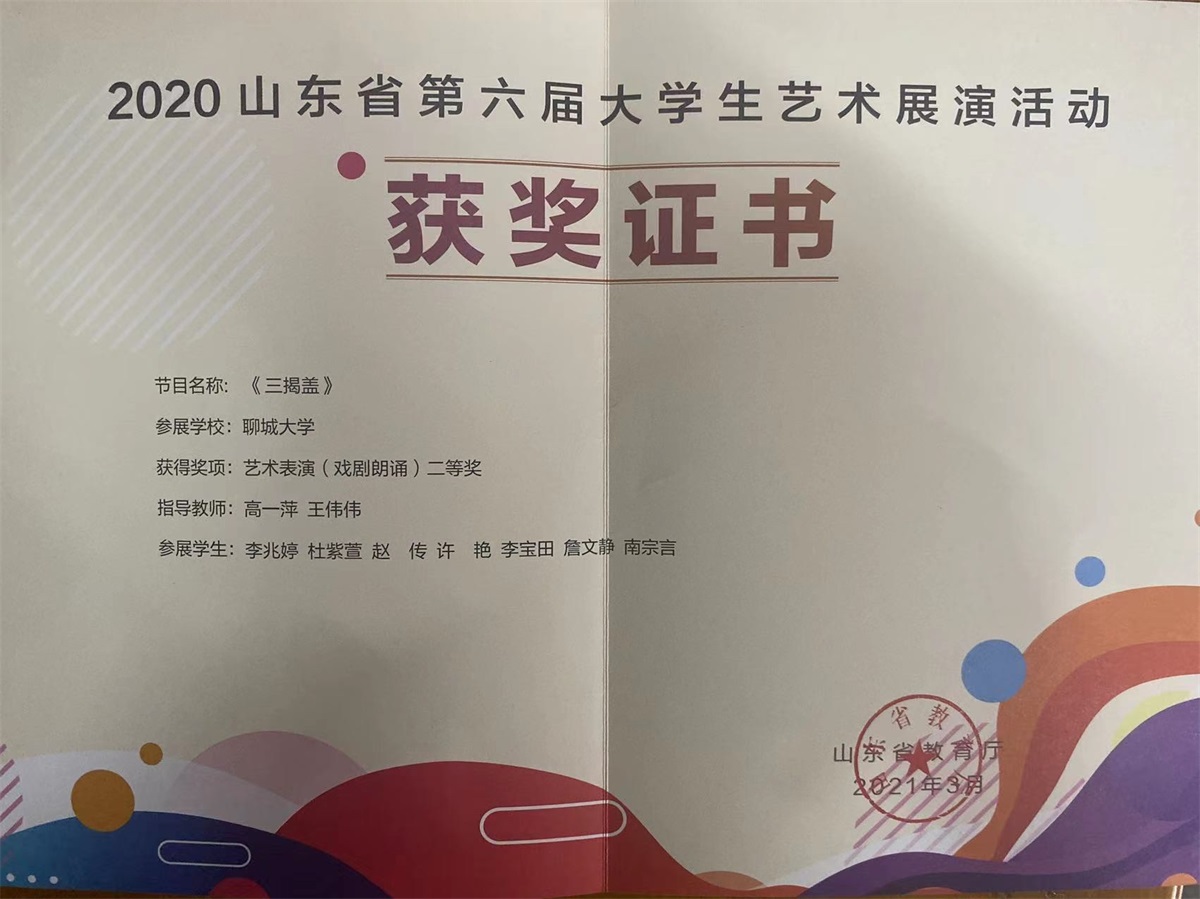 李兆婷、杜紫萱、赵传、许艳、李宝田、詹文静、南宗言,山东省第六届大学生艺术展演活动二等奖