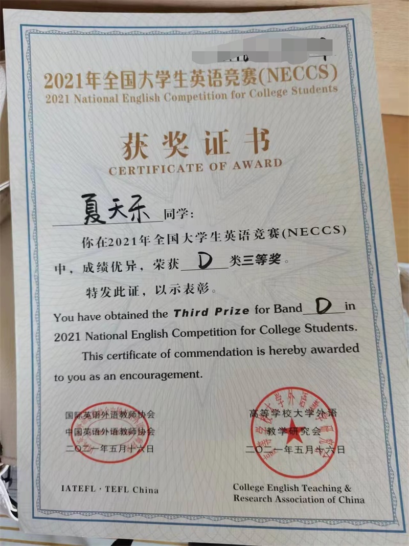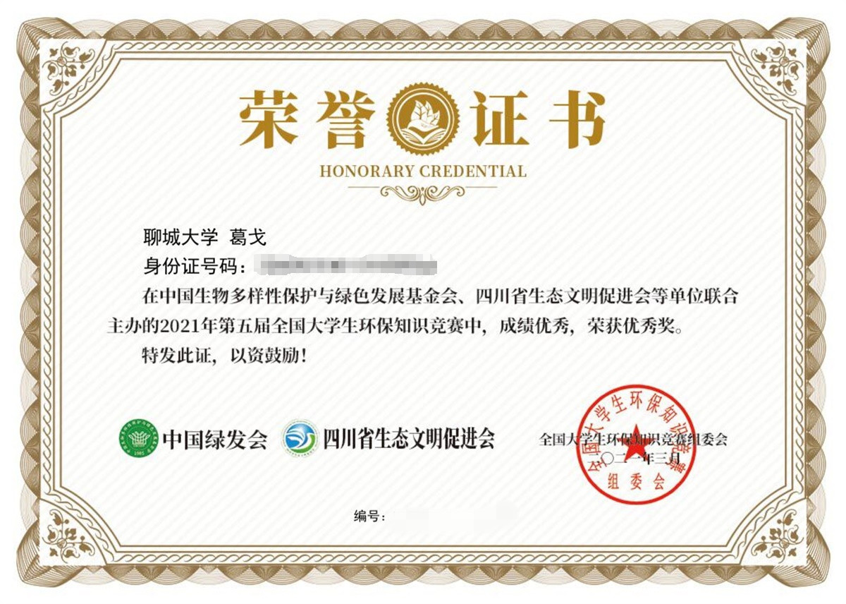 葛戈,2021年第五届全国大学生环保知识竞赛优秀奖