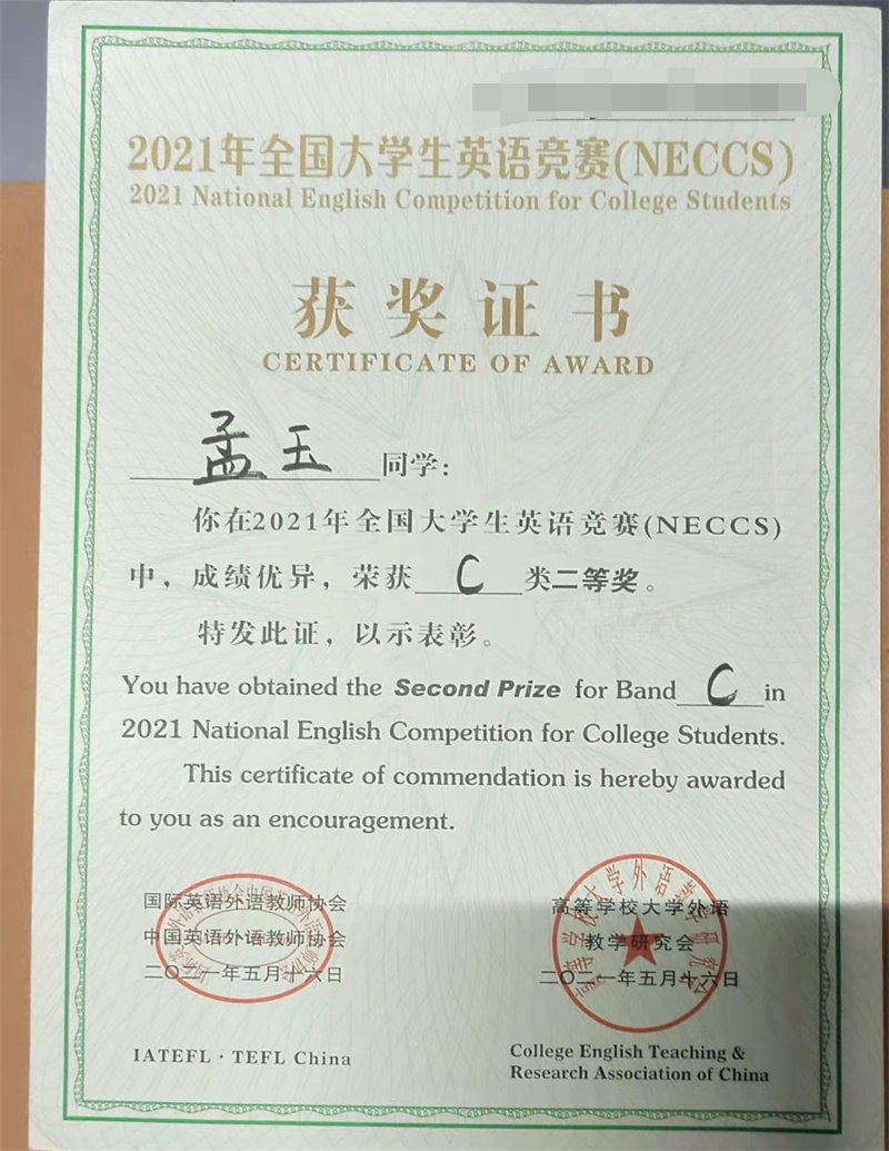王子涵,2021年第五届全国大学生环保知识竞赛优秀奖