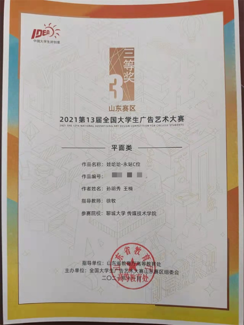 孙明秀、王楠,2021第13届大学生广告艺术大赛三等奖(山东赛区)