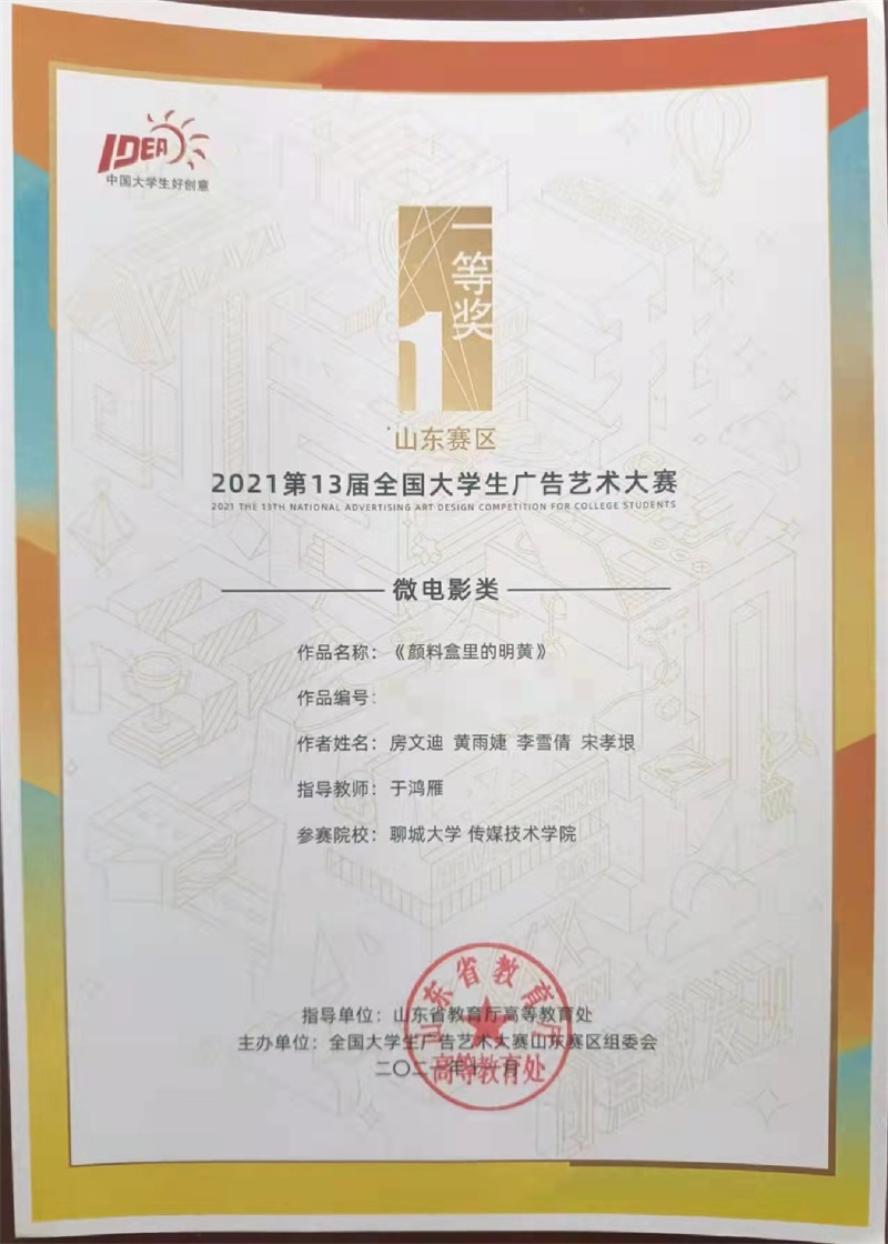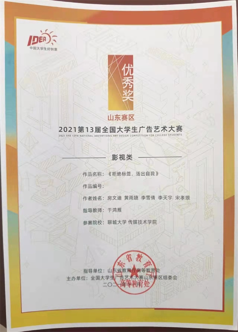 房文迪、黄雨婕、李雪倩、李天宇、宋孝垠,2021第13届大学生广告艺术大赛优秀奖(山东赛区)