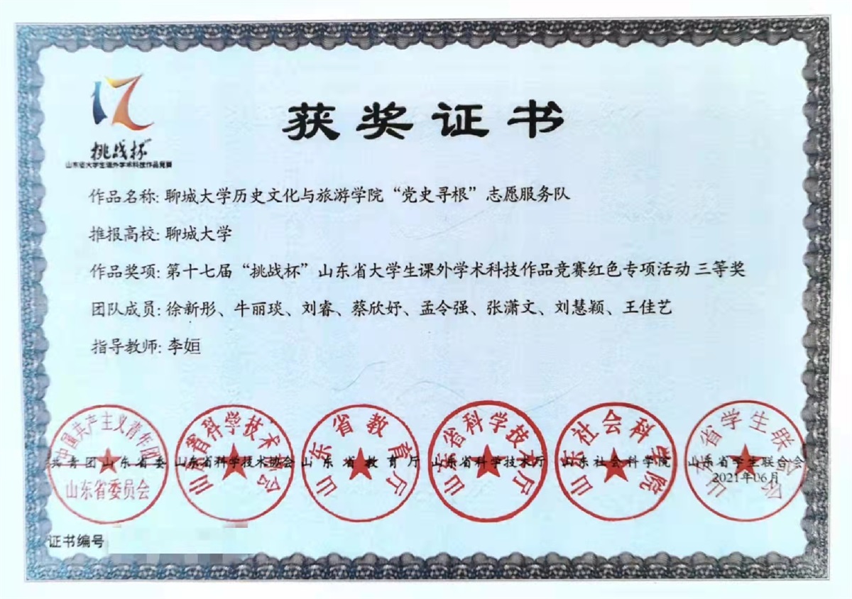 徐新彤、牛丽琰、刘睿、蔡欣妤、孟令强、张潇文、刘慧颖、王佳艺,第十七届“挑战杯”山东省大学生课外学术科技作品竞赛红色专项活动三等奖