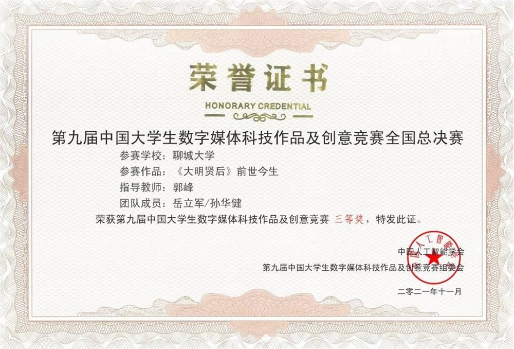 岳立军、孙华健,第九届中国大学生数字媒体科技作品及创意竞赛三等奖