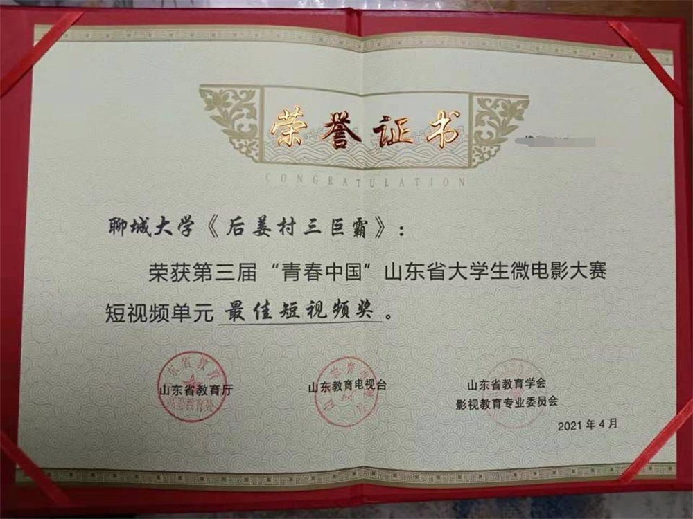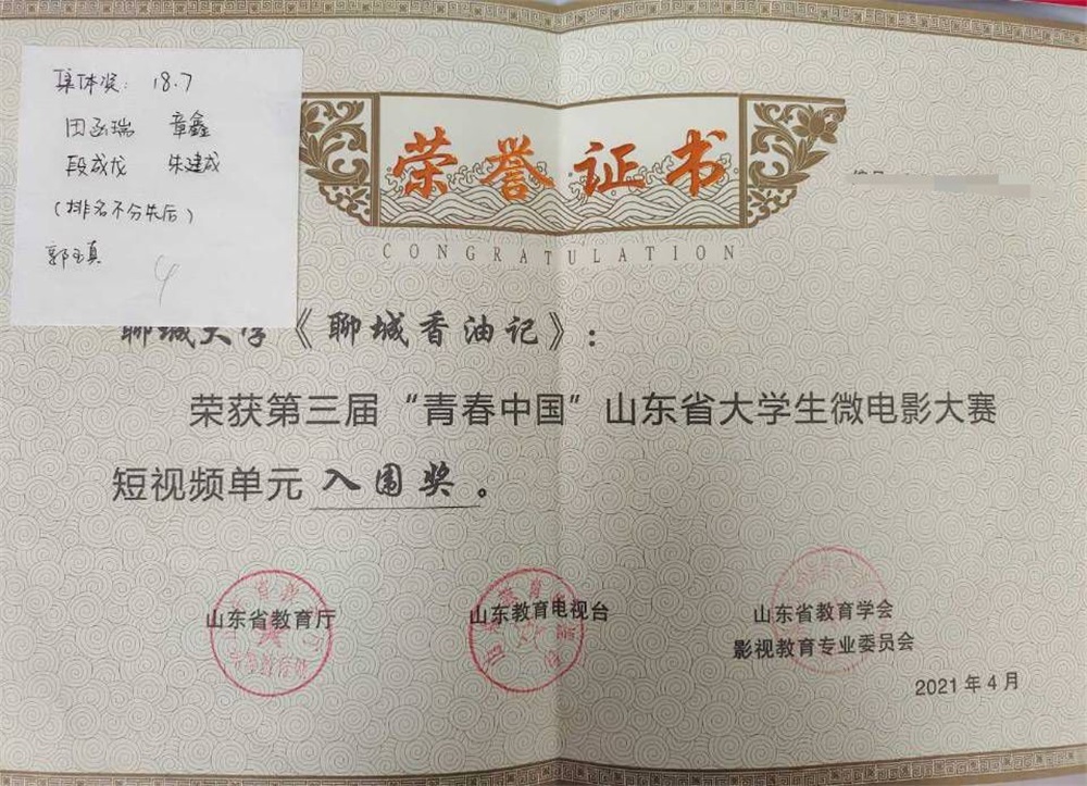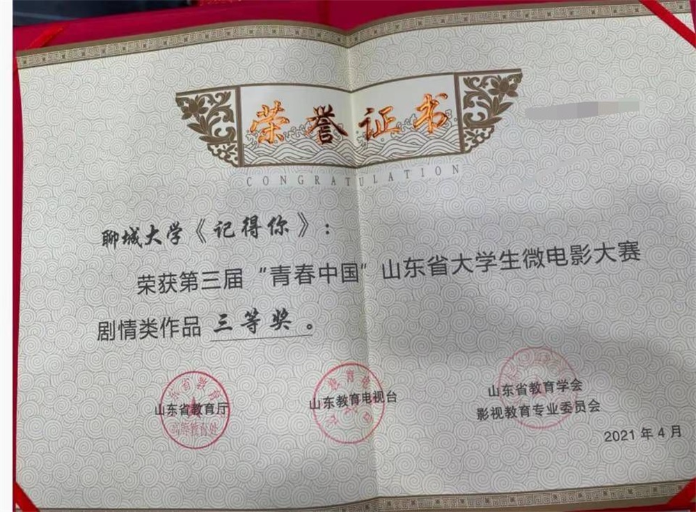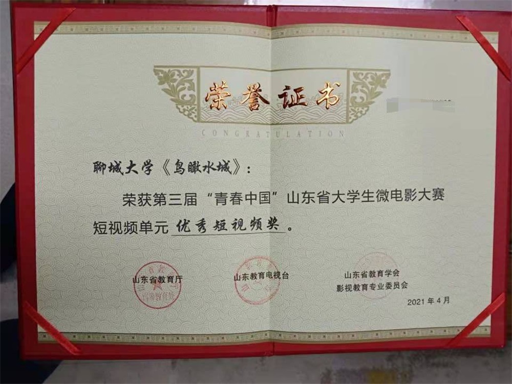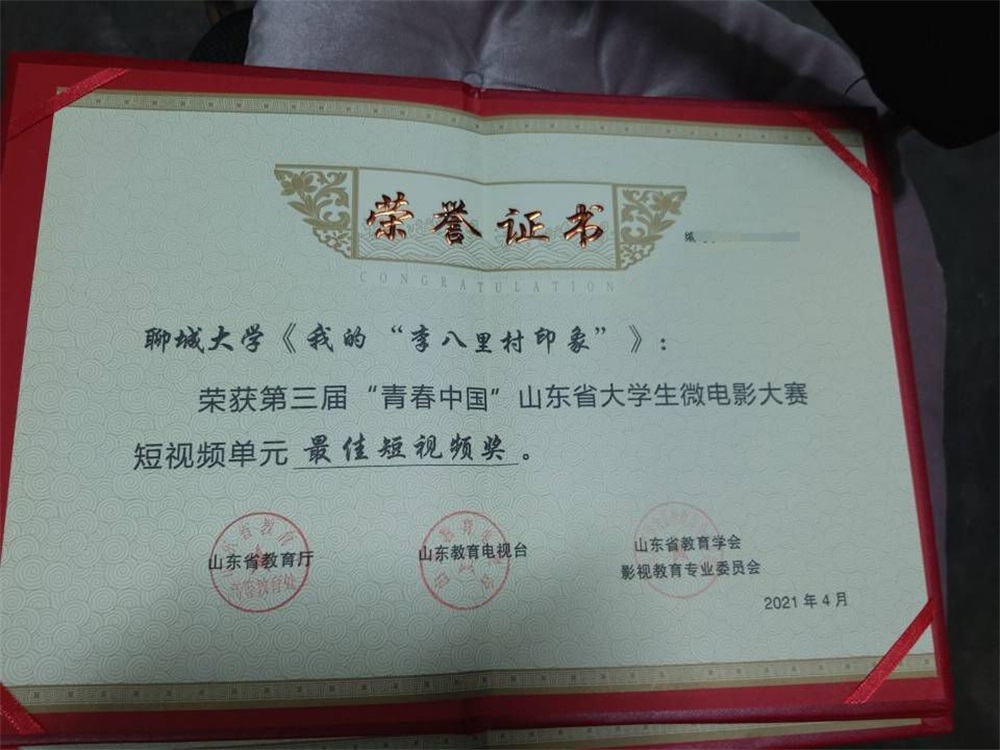 李从睿,第三届”青春中国“山东省大学生微电影大赛最佳短视频奖