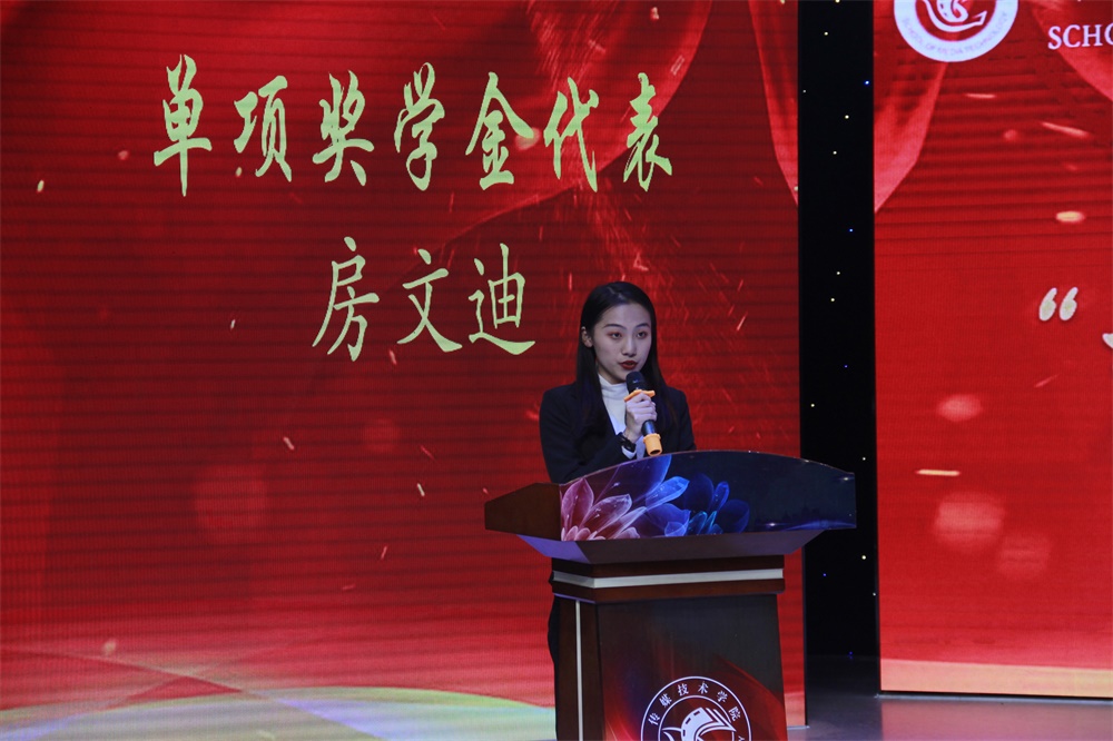 奖学金颁发完毕后,四位学生代表分别上台发言,省政府奖学金获得者刘珺绯同学表示,“躬行长才干,实践出真知。”在学生会工作期间,自己有很多收获,自身的能力也得到很大提升,同时从学习方法、工作成果和创新经历等方面的强调了实践对自身进步的重要性。