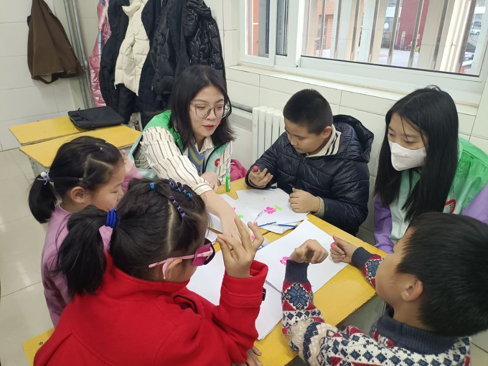 在基本了解手指画后,志愿者们带领同学们一起完成手指画作品,让孩子们在亲身操作中体会手指画的魅力,提高动手能力和实践能力。活动临近尾声,同学们在志愿者们的帮助下各自完成了自己的创作作品,积极地上台展示并分享绘画的过程和感悟,整个课堂充满了温暖与快乐。