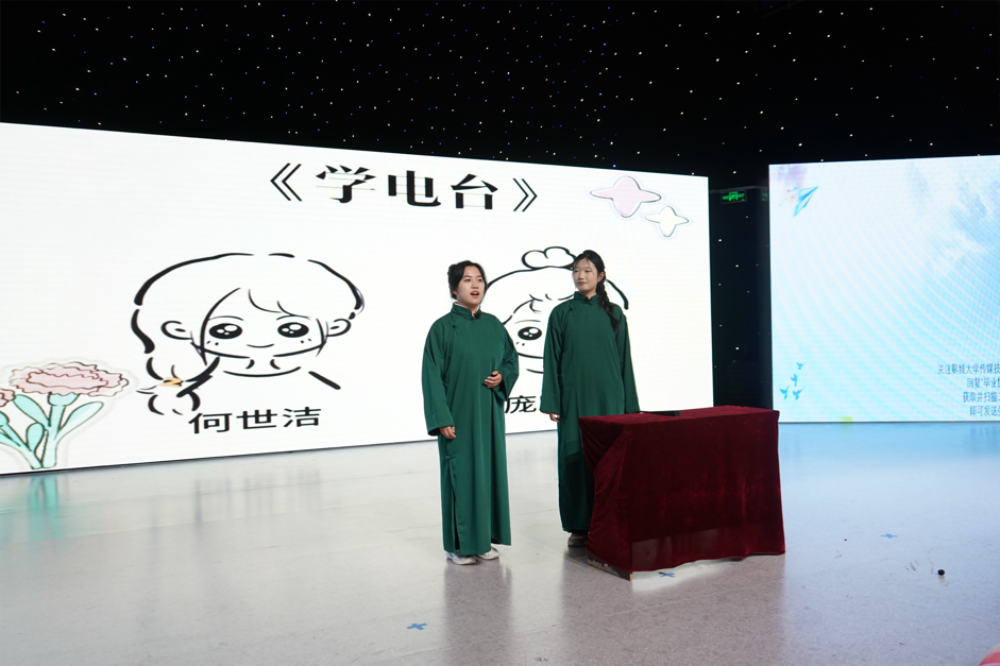 说学逗唱,尽展幽默风采。何世洁、庞宇彤带来的相声《学电台》用妙趣横生、妙语连珠的语言,以其精湛的表演功力为大家带来了一场精彩有趣的演出,赢得了在场师生的阵阵掌声,表达了对毕业生的美好祝愿。
