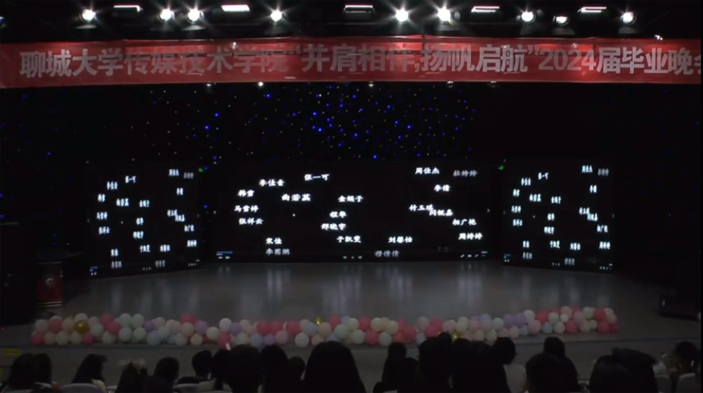 在暖场节目结束后,四位主持人出场并开始致辞,他们向辛勤耕耘、无私奉献的老师们表示最诚挚的感谢,表示学生们会继续保持初心、砥砺前行,谨遵母校的教诲,毕业晚会正式拉开序幕。