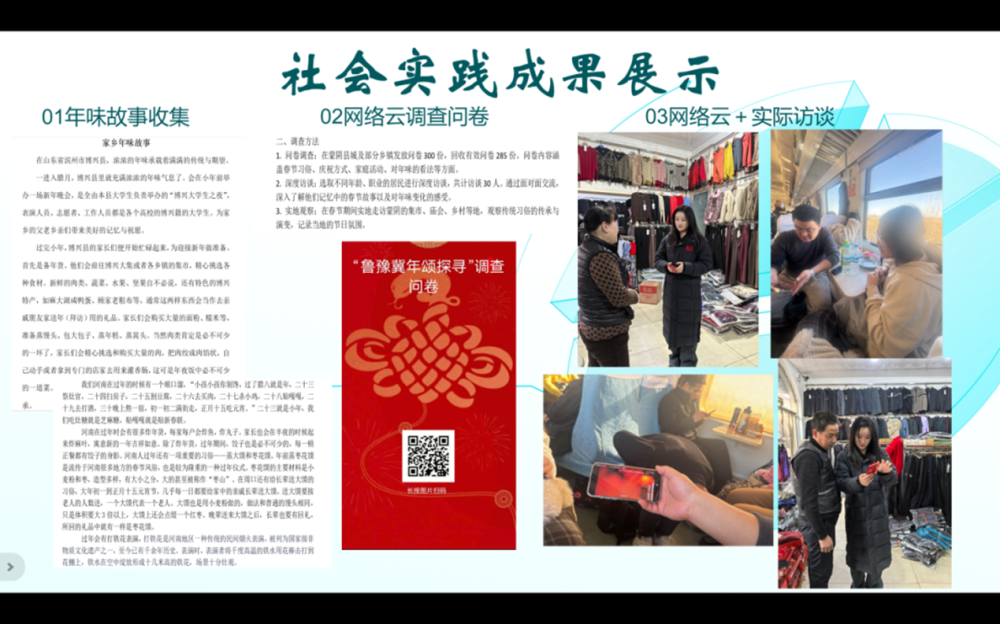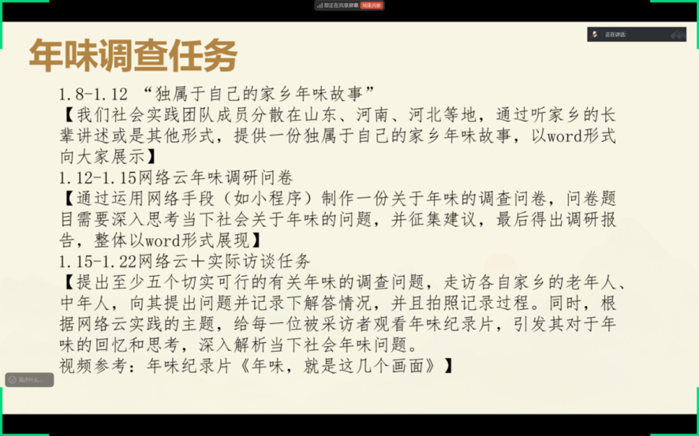 寻觅传统年俗,共筑文化记忆。活动伊始,负责人将实践队队伍分为两组,分别针对山东省内外地区展开网络调研。1月8日,通过线上视频会议,负责人明确了实践活动的目标,详细规划了活动流程,并将实践内容细化为寻找年味故事、探究年味文化内涵及解答年味相关问题三大核心步骤。