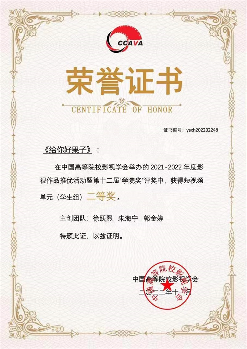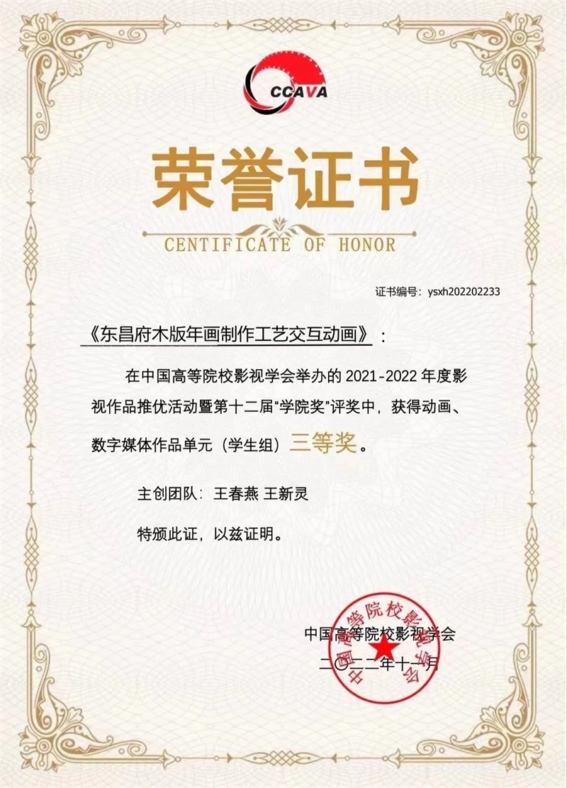 郝翰、牛丽娟、于鸿雁三位老师指导,由徐跃熙、朱海宁、郭金婷三位学生共同创作的作品《给你好果子》获得短视频单元学生组二等奖,王春燕、王新灵的主创作品《东昌府木版年画制作工艺交互动画》获得动画、数字媒体作品单元学生组三等奖的好成绩,李从睿、刘丽霞的主创作品《老兵永远跟党走》获得短视频单元学生组三等奖的好成绩。