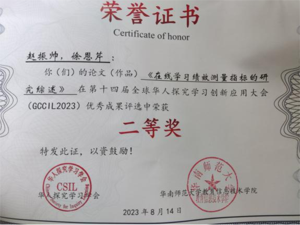 教育技术学专业21级研究生赵振帅参加了本次会议,并做了题为《在线学习绩效测量指标的研究综述》的分论坛报告,在报告中,赵振帅同学详细介绍了研究背景、核心概念、研究设计、研究结果及结论,深入阐述了当前在线学习绩效各项测量指标的含义、重要性、测量方法和测量工具,并对如何有效地使用它们来评估在线学习的效果进行了总结。与会专家肯定了赵振帅同学论文的研究价值,并从文章结构和内容方面提出了针对性修改建议。最终该论文在会议的论文评选中获得二等奖。参会结束之后,赵振帅同学及时向导师汇报了会议的收获,表示通过这次年会,拓展了学术视野,了解到自己研究中存在的问题和不足,明确了改进的方向。