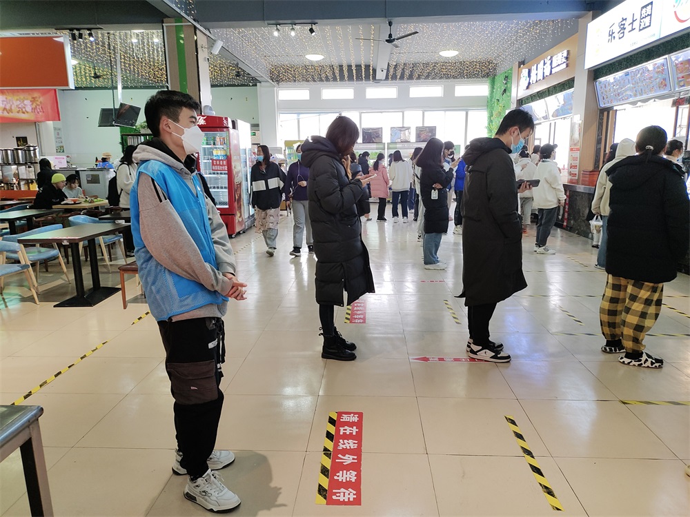 其中,部分志愿者们于餐厅中协调秩序,安排学生错峰用餐,并提醒同学们自觉佩戴口罩,执行“一米线间隔”原则有序排队购餐。志愿者成员还在人流量大的马路周边对防疫意识欠佳的同学们进行沟通劝导,通过指示牌上铿锵有力的话语督促学生谨记疫情防控的重要性。在宿舍中,志愿者成员认真值班登记,统计人员流动行程,借助扩音器普及相关防疫知识,以实际行动为打赢疫情防控攻坚战贡献志愿者服务力量。