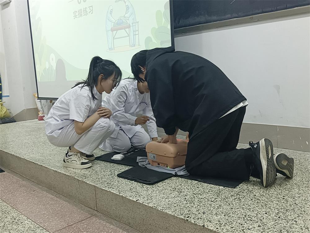 学急救知识,保生命安全。本次宣讲活动主要讲解了心肺复苏、触电急救等基础的急救方法。主讲人采用讲解与案例相结合的方式,通过视频案例突显掌握正确科学的急救措施在危急时刻的重要性,极大地提高了同学们学习急救技能的积极性,并利用心肺复苏模拟人进行操作示范,对心肺复苏的重点步骤进行详细讲解,随机抽取场下同学进行实地演练。