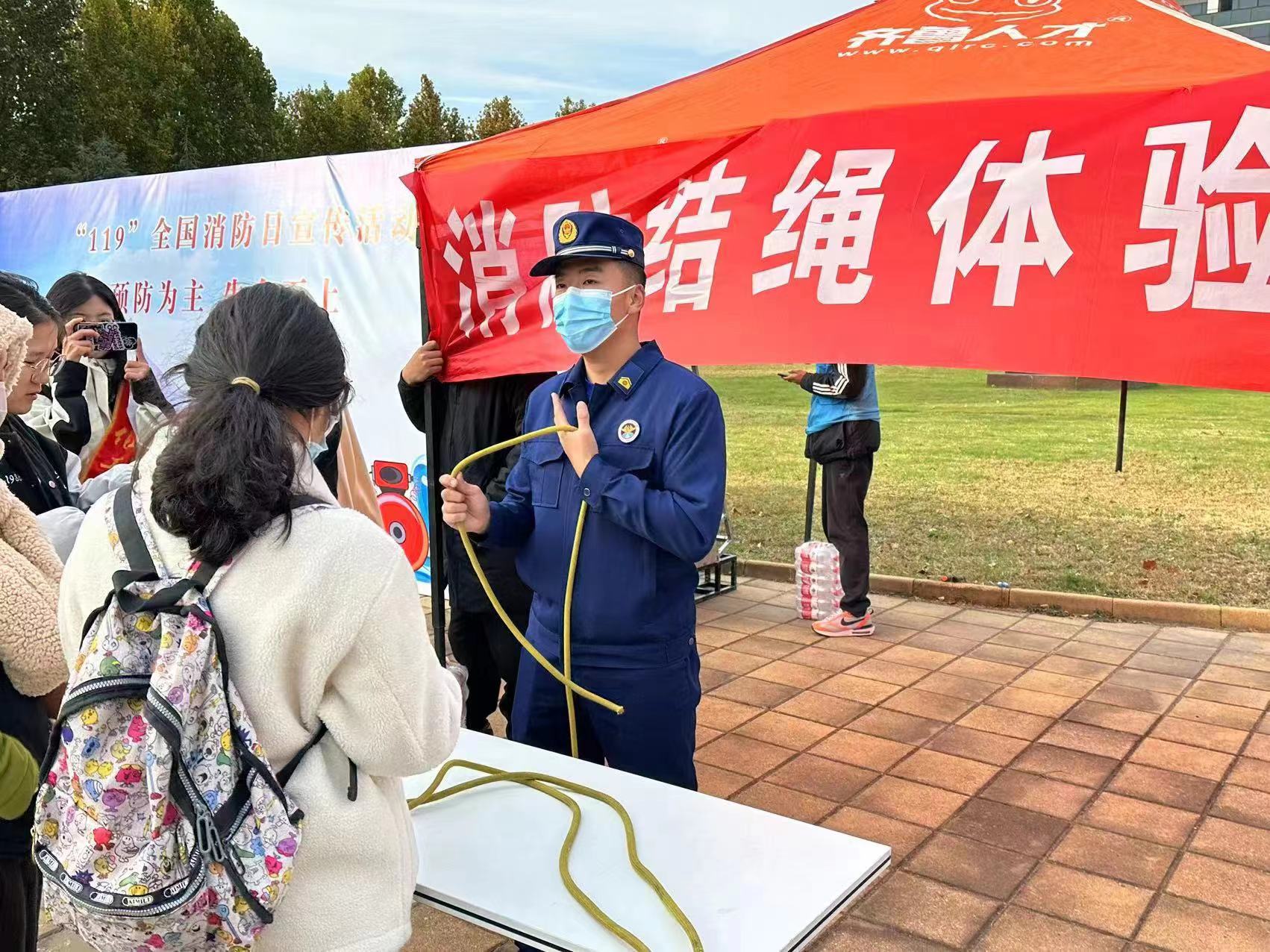 演练结束后,由专业消防人员为大家讲解灭火器的使用方法以及发生火灾时的正确逃生方法,就灭火器使用四步法“一提、二拔、三瞄、四压”进行实际操练,同时设置互动环节与同学们进行问答与交流。互动结束后,专业人员于消防绳体验区讲解了消防绳的使用方法,注意事项以及在火灾中的逃生场景,就地讲解并演示了海姆立克法的操作步骤与注意事项,在工作人员指导下,同学们进行实践操作体验,以模拟练习的方式熟练掌握应急技能,将消防安全知识深化于心。