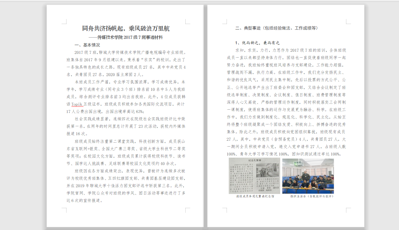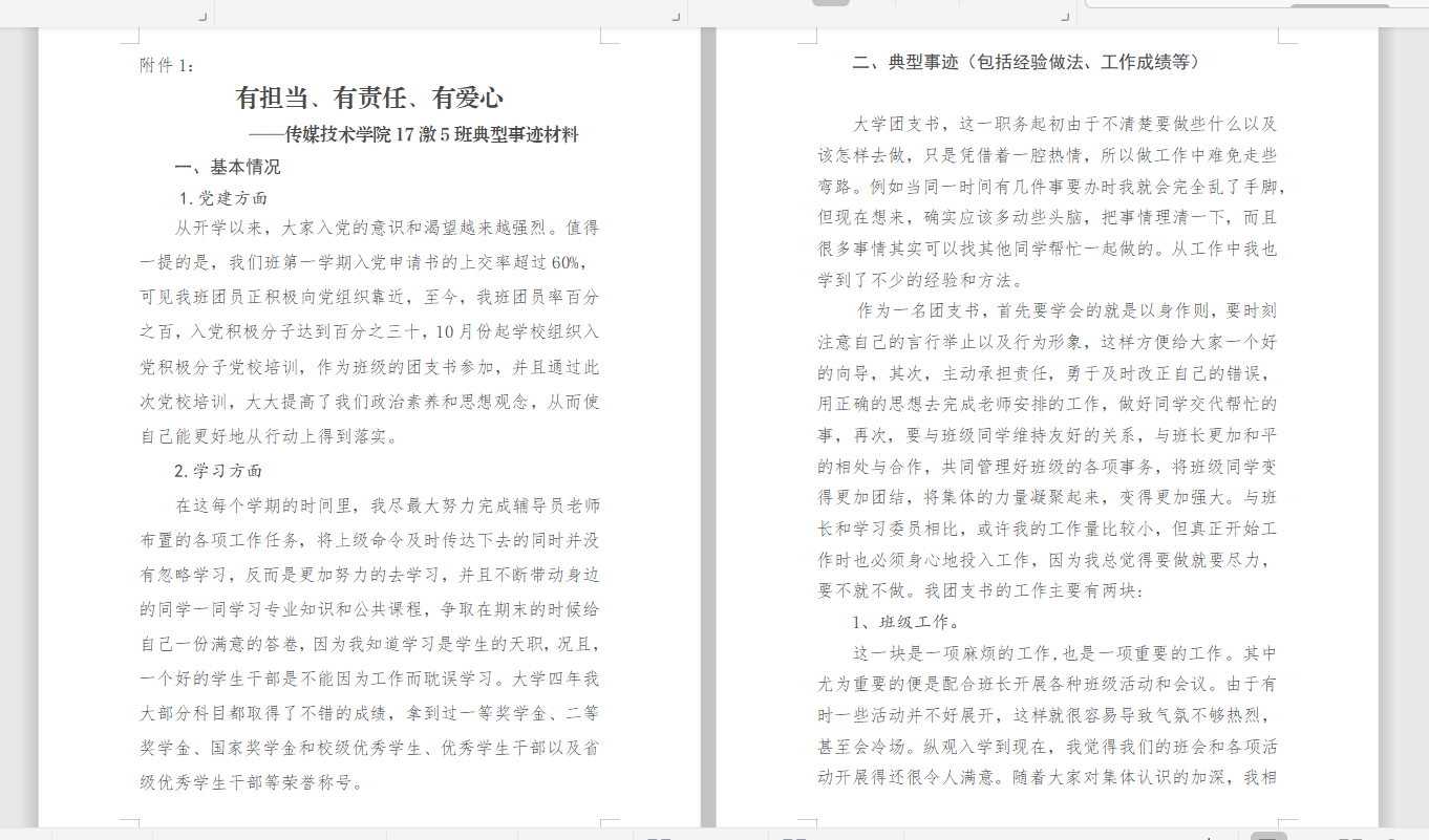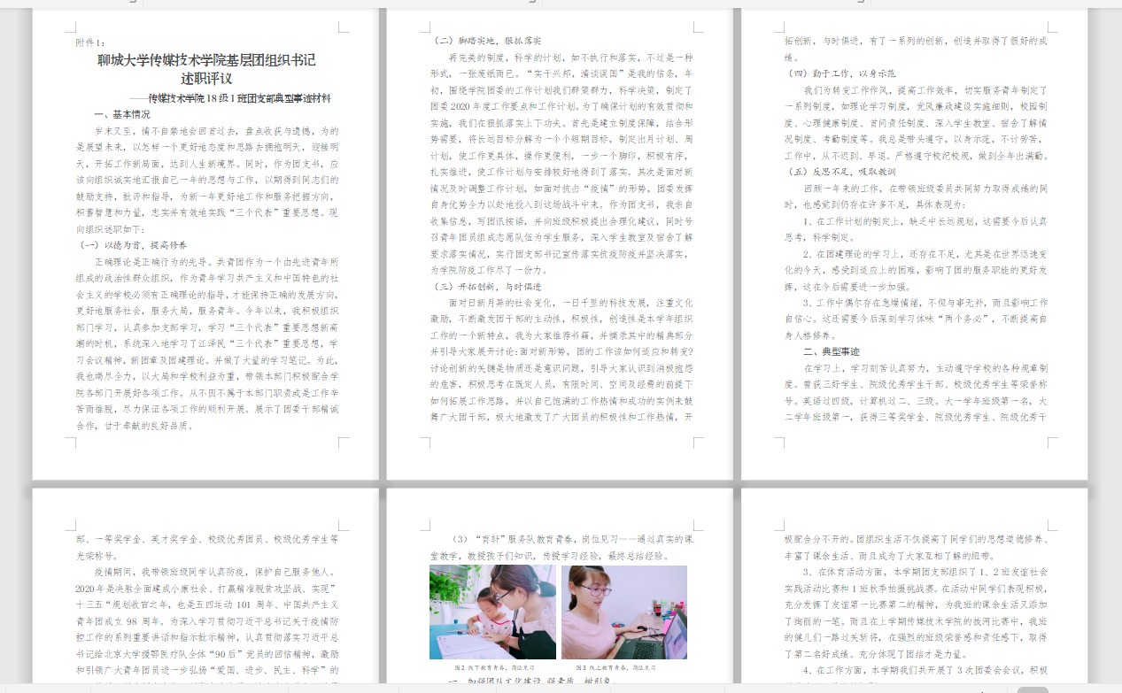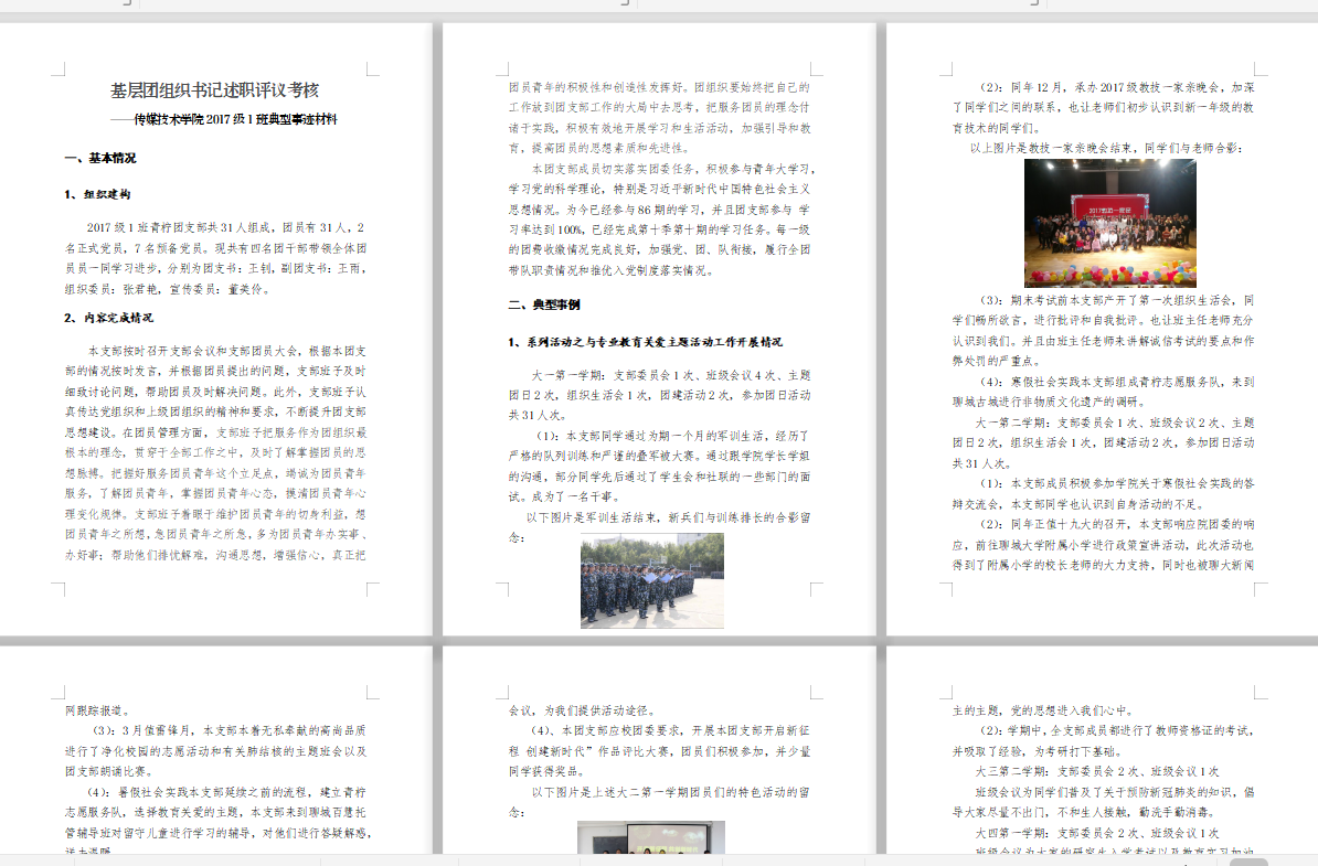 2017级、2018级各团支部书记在述职材料中,通过对团支部基本情况和典型事迹的详细介绍,说明了团支部的发展记录、发展规划和目标、制度建设以及支部精神等方面内容。