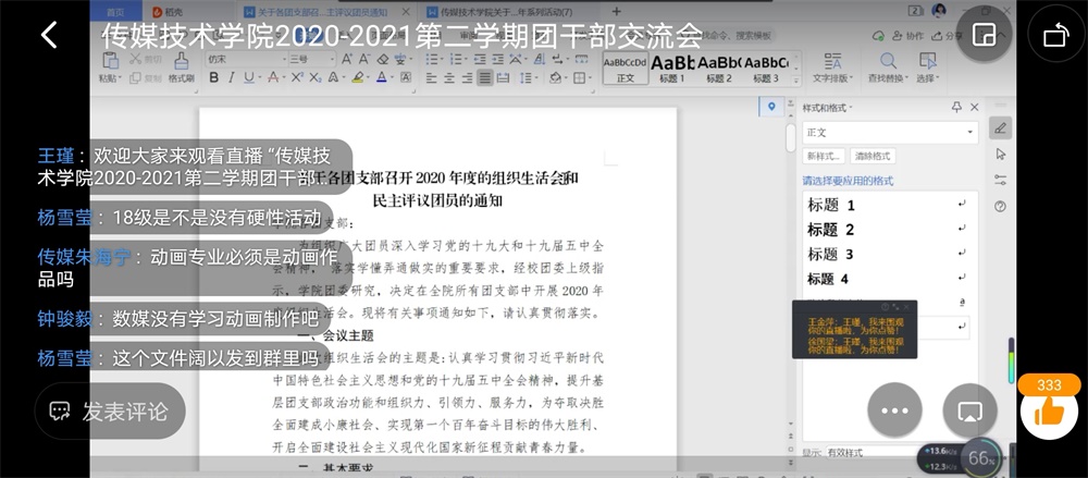 本次活动采用钉钉线上直播的形式进行。活动伊始,主讲人王瑾根据文件内容,为学院团干部详细讲解了关于各班开展组织生活会、民主评议团员和团日活动的具体要求和内容。会议上,王瑾指出各班要认真对待组织主题学习、召开支部大会、开展教育评议、做好结果运用四项工作,掌握“智慧团建”系统的使用。同时,团干部要起到带头作用,认识到组织生活会开展的重要性,在民主评议方面真正做到公平、公正,为建设优秀班级奠定良好基础。