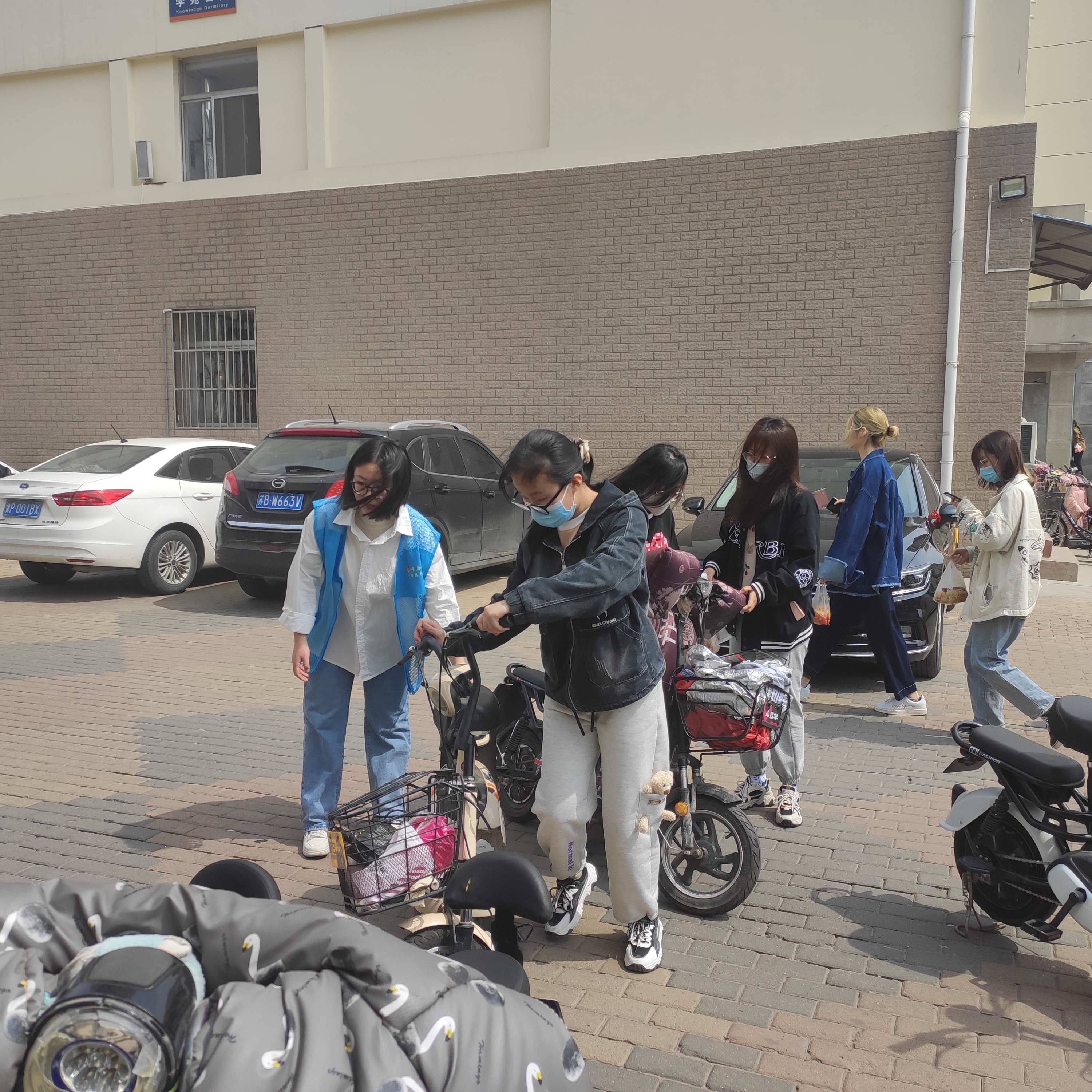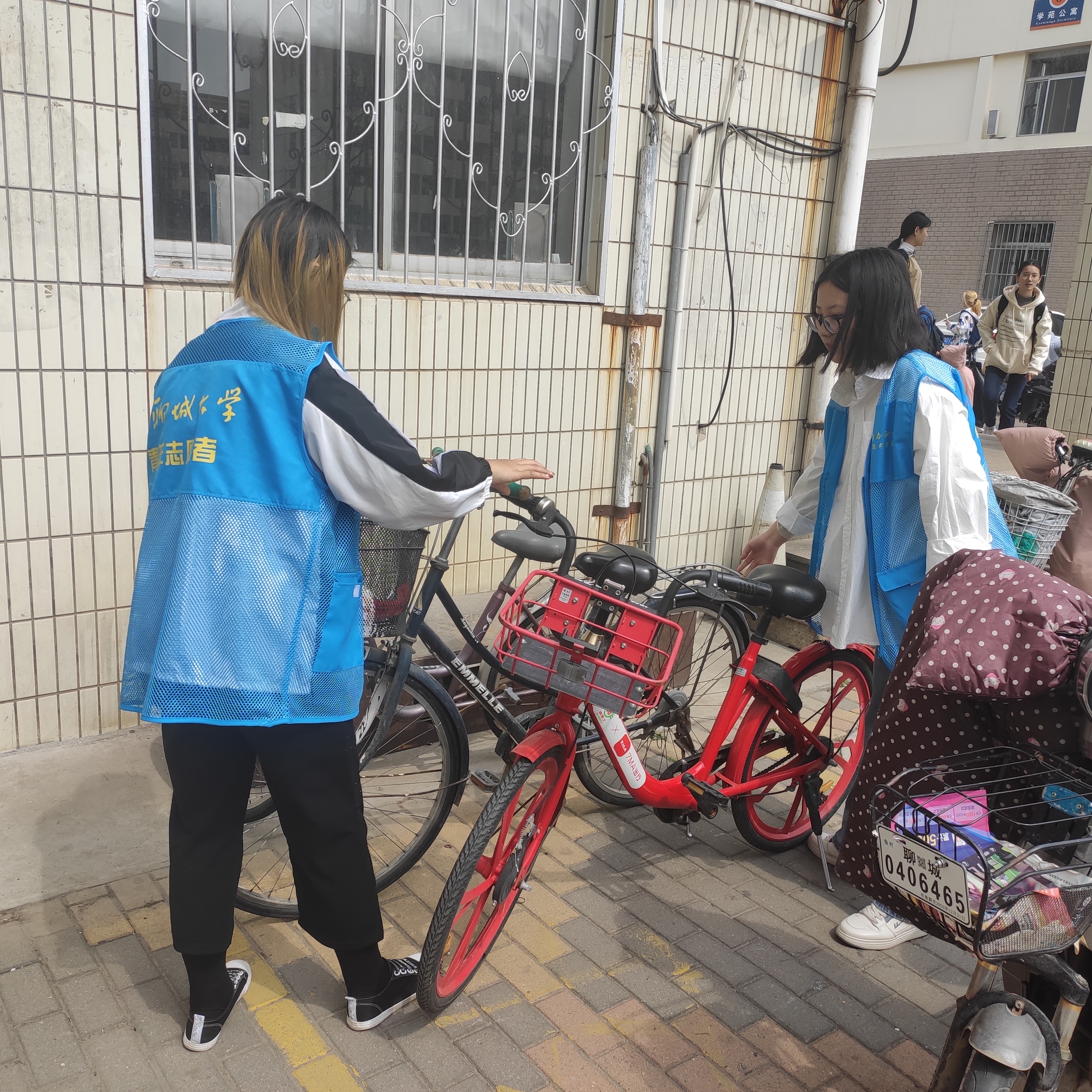 二组、三组依序进行,每位同学都积极参与、团结协作,摆正停靠歪斜的自行车、搬动共享单车回归原位、耐心劝导过路的同学有序停车。正午气温逐渐升高,但志愿者们热情不减,让杂乱的停车区恢复秩序井然,维护了良好的出行秩序。