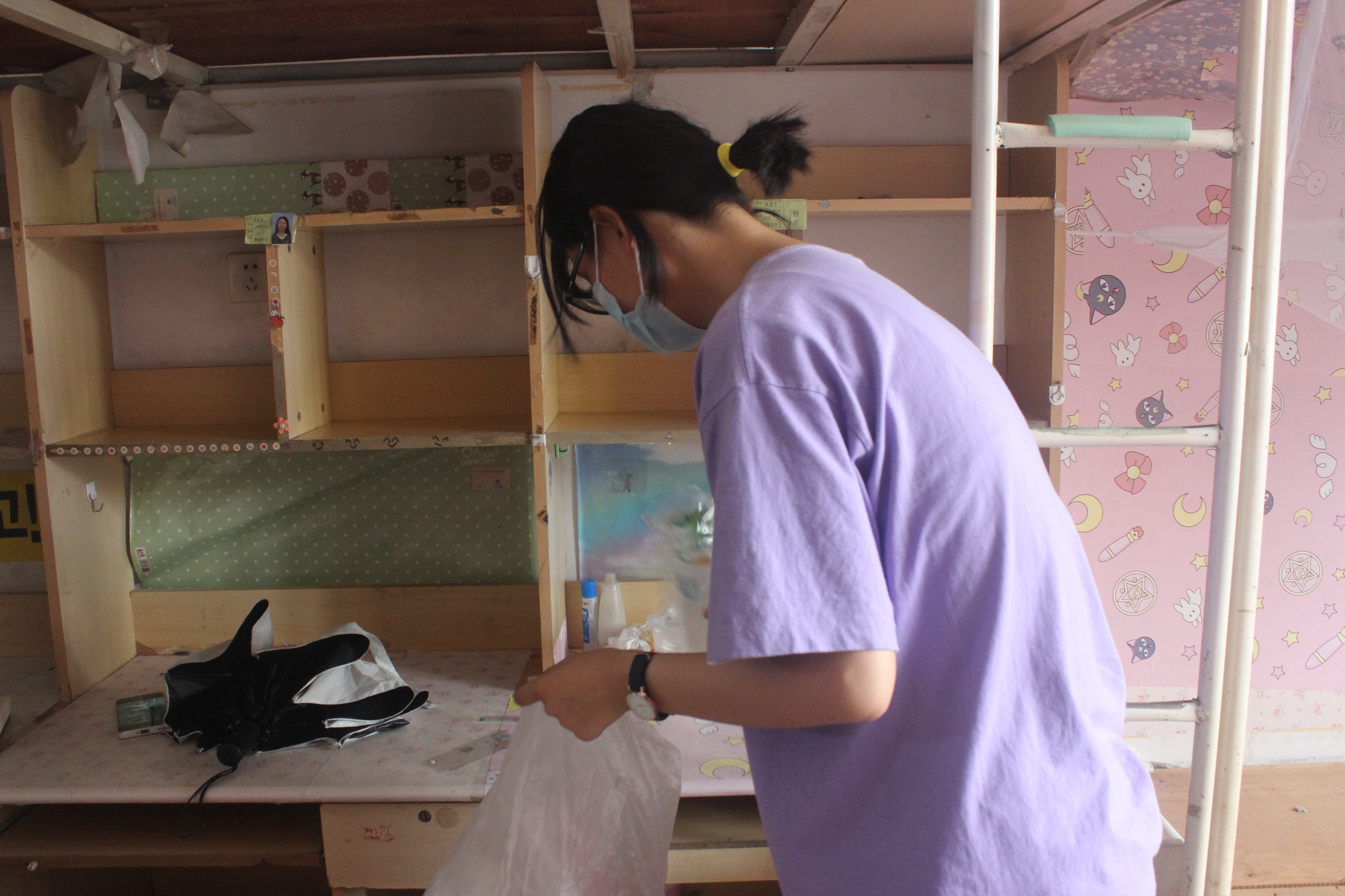 赵勇老师不顾被汗水浸湿的衬衫,一次又一次的往返于洗刷间和宿舍,细心的清理桌子上沾染的污垢以及地面上的油污。他们不惧高温酷暑,拿着各种卫生工具穿梭于宿舍楼内,从宿舍内部的清扫,到垃圾的运送,不论是扫地还是拖地,每个人都认真负责,以高标准和严要求完成清扫任务。汗流浃背挡不住老师和同学们的热情,在师生的共同努力下,全体毕业生宿舍环境得到改善,窗明几净、一尘不染。最后由宿管部成员统一验收清扫成果,活动至此圆满结束。