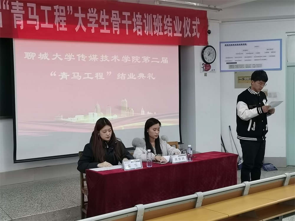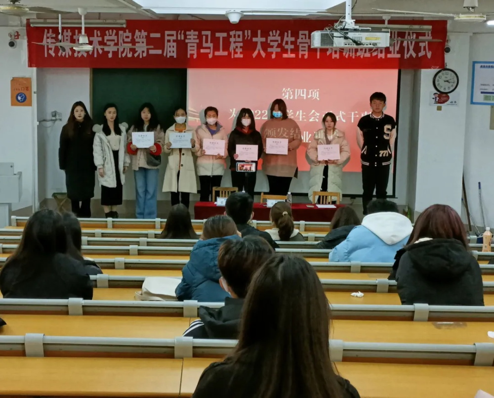 2022届学生会正式干事名单,向他们表示祝贺,并发出倡议希望学员们以饱满的热情和激情在今后的学习工作中勇往直前,为学院、为学校、为社会贡献出一份力量,同时评选出了此次“青马工程”中各班的优秀学员,为他们颁发了结业证书,并激励各位优秀学员在之后的工作上再接再厉,鼓励了其他学员,向优秀看齐,不断进步。伴随着学员们昂扬的团歌声,第二届“青马工程”大学生骨干培训班结业仪式画上了圆满的句号。