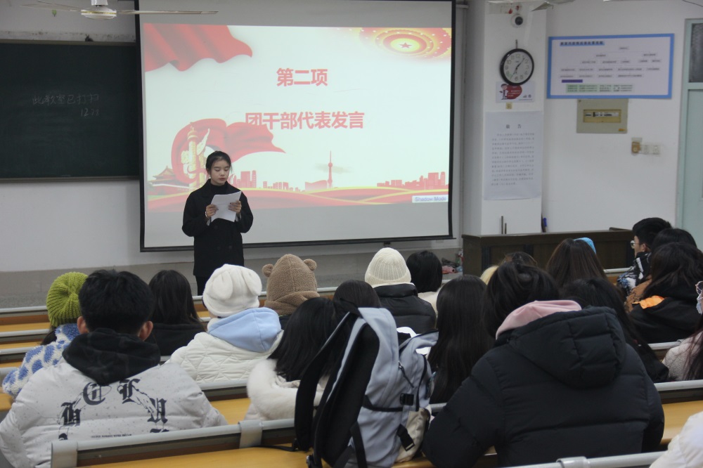 本次活动围绕齐唱国歌、团干部代表发言、宣读入团誓词、共温团歌四部分展开。活动伊始,全体团干部起立共唱国歌。在庄严的气氛中,2020级2班的团支书宋佳作为优秀代表进行发言,点明作为团干部的重要责任,号召团员尽职尽力地做好本职工作,使在场同学们再次深入理解了作为一名团员的责任和义务。在侯继斌同学的带领下,团员们纷纷起立、举起右拳,再次宣读誓词,重温入团时的庄严时刻。